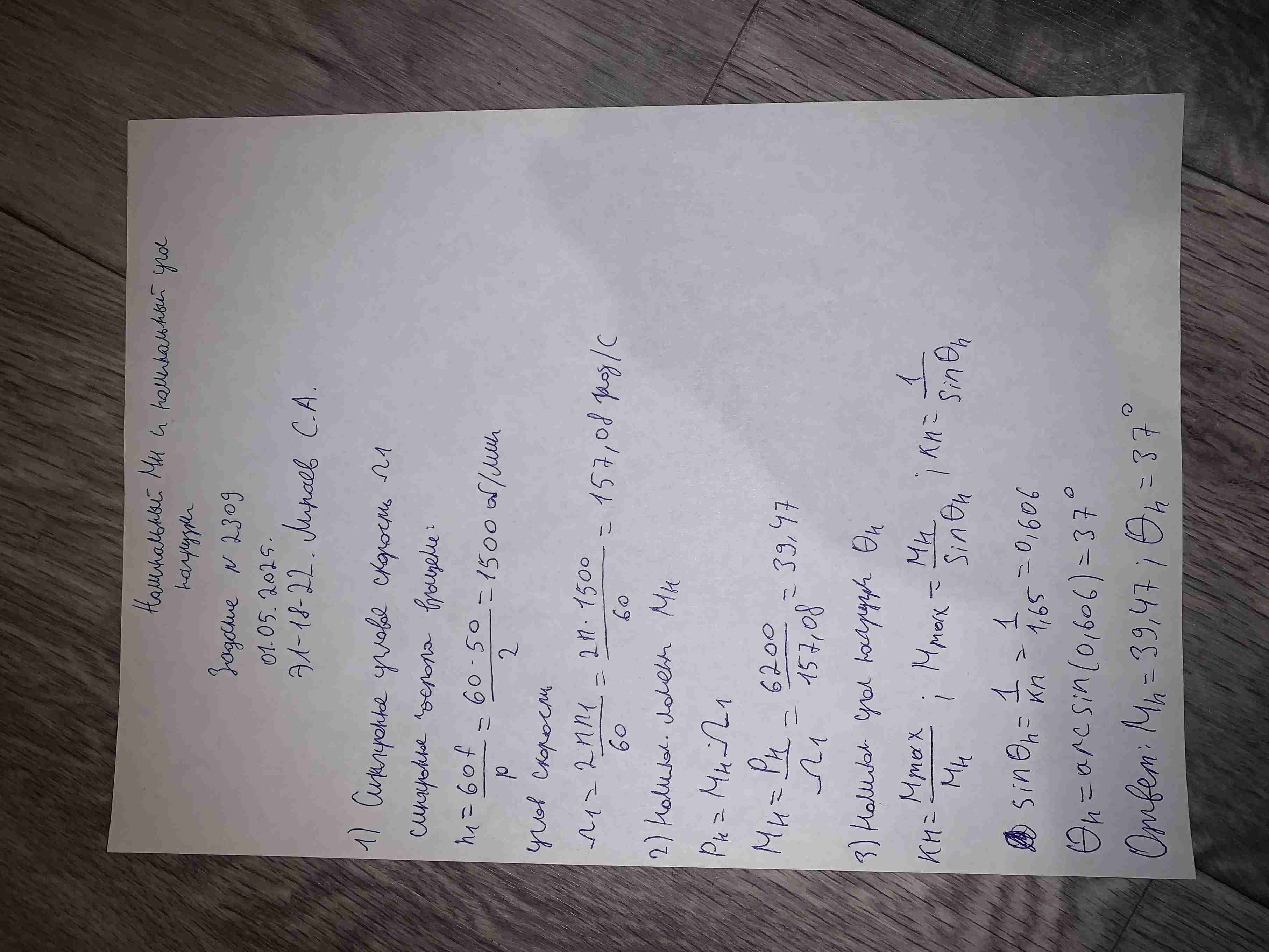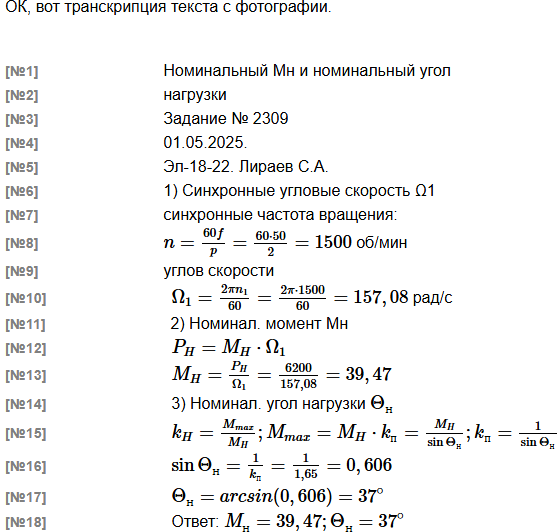 | Дано: Синхронный 4-полюсный двигатель с неявнополюсным ротором мощностью 6200 Вт питается от трехфазной сети частотой 50 Гц с напряжением U1 = 380 В. Найти: номинальный момент Mн и номинальный угол нагрузки θн (с точностью до 1 градуса), если величина статической перегружаемости двигателя 1,65 При решении задачи используйте рекомендованные обозначения. Мощность двигателя: Pн Частота сети: f Cтатическая перегружаемость: kп Число пар полюсов двигателя: p Синхронная частота вращения: n1 Синхронная угловая скорость: Ω1 Номинальный угол нагрузки: θн |