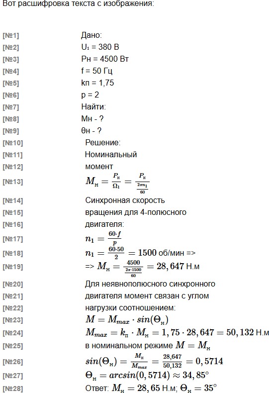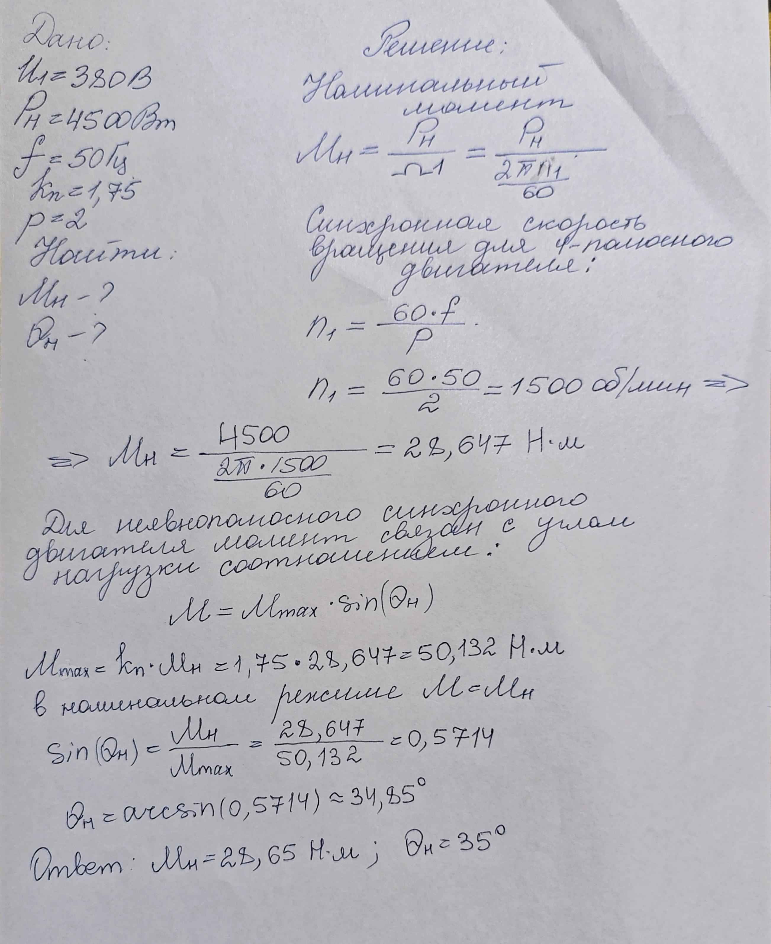 | Дано: Синхронный 4-полюсный двигатель с неявнополюсным ротором мощностью 4500 Вт питается от трехфазной сети частотой 50 Гц с напряжением U1 = 380 В. Найти: номинальный момент Mн и номинальный угол нагрузки θн (с точностью до 1 градуса), если величина статической перегружаемости двигателя 1,75 При решении задачи используйте рекомендованные обозначения. Мощность двигателя: Pн Частота сети: f Cтатическая перегружаемость: kп Число пар полюсов двигателя: p Синхронная частота вращения: n1 Синхронная угловая скорость: Ω1 Номинальный угол нагрузки: θн |