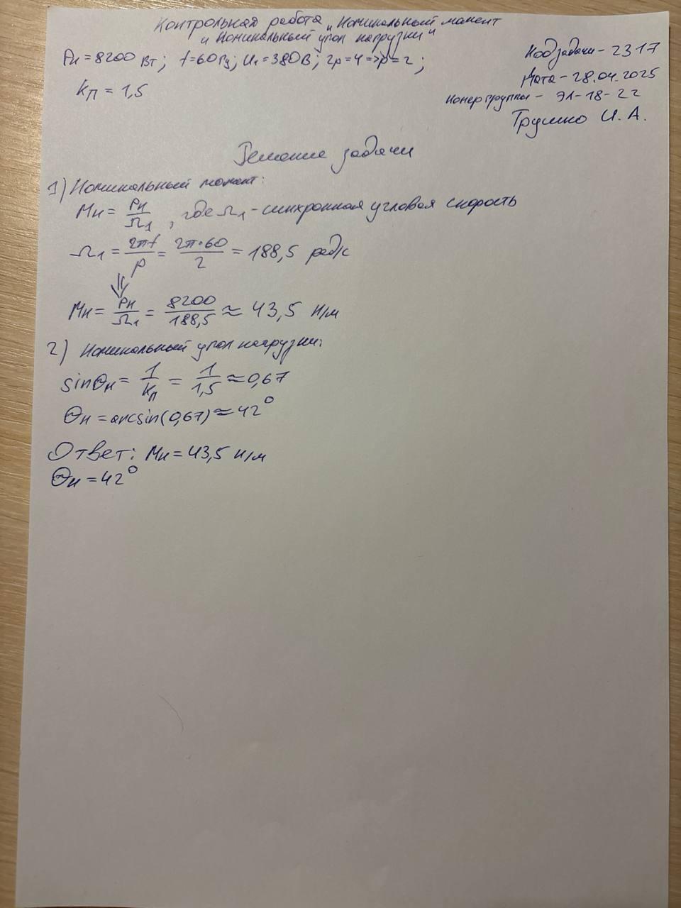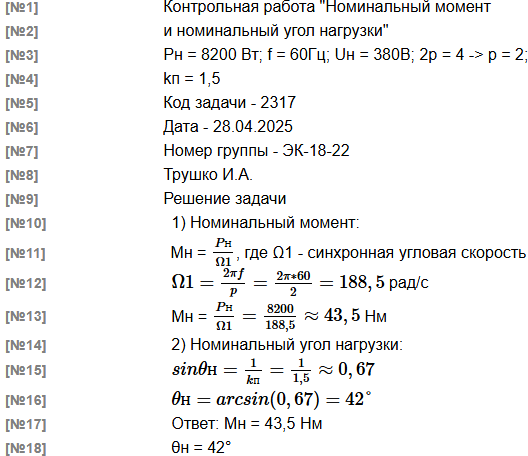 | Дано: Синхронный 4-полюсный двигатель с неявнополюсным ротором мощностью 8200 Вт питается от трехфазной сети частотой 60 Гц с напряжением U1 = 380 В. Найти: номинальный момент Mн и номинальный угол нагрузки θн (с точностью до 1 градуса), если величина статической перегружаемости двигателя 1,50 При решении задачи используйте рекомендованные обозначения. Мощность двигателя: Pн Частота сети: f Cтатическая перегружаемость: kп Число пар полюсов двигателя: p Синхронная частота вращения: n1 Синхронная угловая скорость: Ω1 Номинальный угол нагрузки: θн |