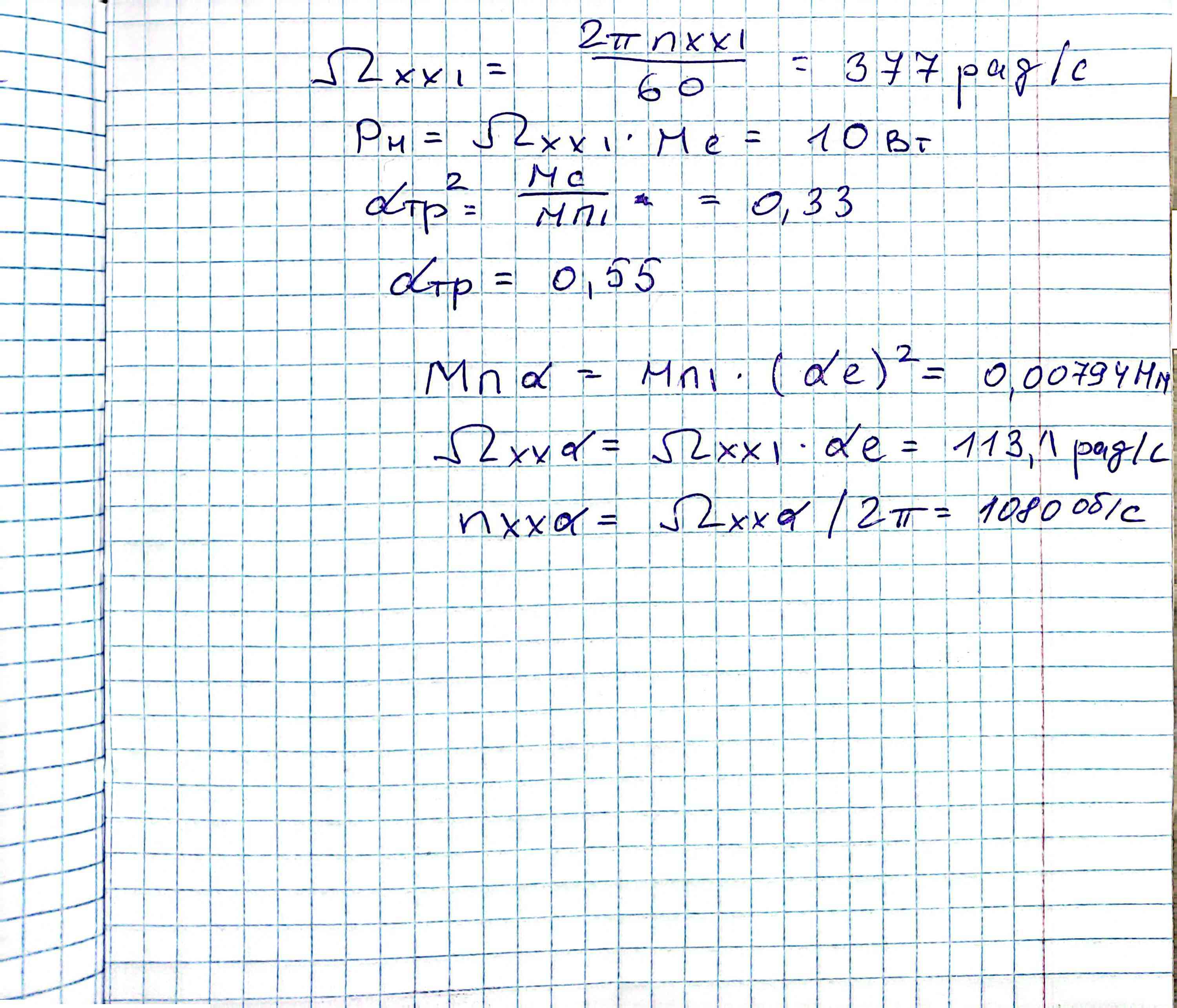 Дано. Идеальный асинхронный исполнительный двигатель при амплитудном управлении и при коэффициенте сигнала ae = 1 имеет: пусковой момент Mп1 = 900 гс·см, частоту вращения холостого хода nхх1 = 3600 об/мин. Момент сопротивления нагрузки постоянен Mс = 270 гс·см. Определить: номинальную мощность исполнительного двигателя, сигнал трогания , а также рассчитать пусковой момент, угловую скорость и частоту вращения холостого хода АИД при коэффициенте сигнала αe = 0,3 при амплитудном управлении. Использовать размерности величин в системе СИ. При решения задачи используйте следующие обозначения. Mп1 – пусковой момент при αe = 1 nхх1 – частота вращения при αe = 1 αe – коэффициент сигнала Mс – момент сопротивления нагрузки Mб – базовый момент Ωб – базовая скорость Pб – базовая мощность Pн – номинальная мощность αтр – сигнал трогания Mпα – пусковой момент при заданном αe Ωххα – угловая скорость при заданном αe nххα – частота вращения при заданном αe |