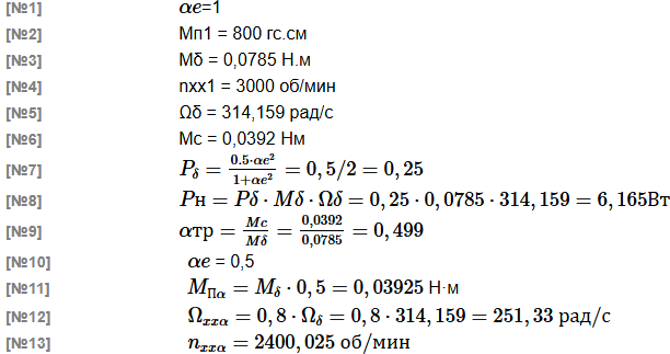 Дано. Идеальный асинхронный исполнительный двигатель при амплитудном управлении и при коэффициенте сигнала ae = 1 имеет: пусковой момент Mп1 = 800 гс·см, частоту вращения холостого хода nхх1 = 3000 об/мин. Момент сопротивления нагрузки постоянен Mс = 400 гс·см. Определить: номинальную мощность исполнительного двигателя, сигнал трогания , а также рассчитать пусковой момент, угловую скорость и частоту вращения холостого хода АИД при коэффициенте сигнала αe = 0,5 при амплитудном управлении. Использовать размерности величин в системе СИ. При решения задачи используйте следующие обозначения. Mп1 – пусковой момент при αe = 1 nхх1 – частота вращения при αe = 1 αe – коэффициент сигнала Mс – момент сопротивления нагрузки Mб – базовый момент Ωб – базовая скорость Pб – базовая мощность Pн – номинальная мощность αтр – сигнал трогания Mпα – пусковой момент при заданном αe Ωххα – угловая скорость при заданном αe nххα – частота вращения при заданном αe |