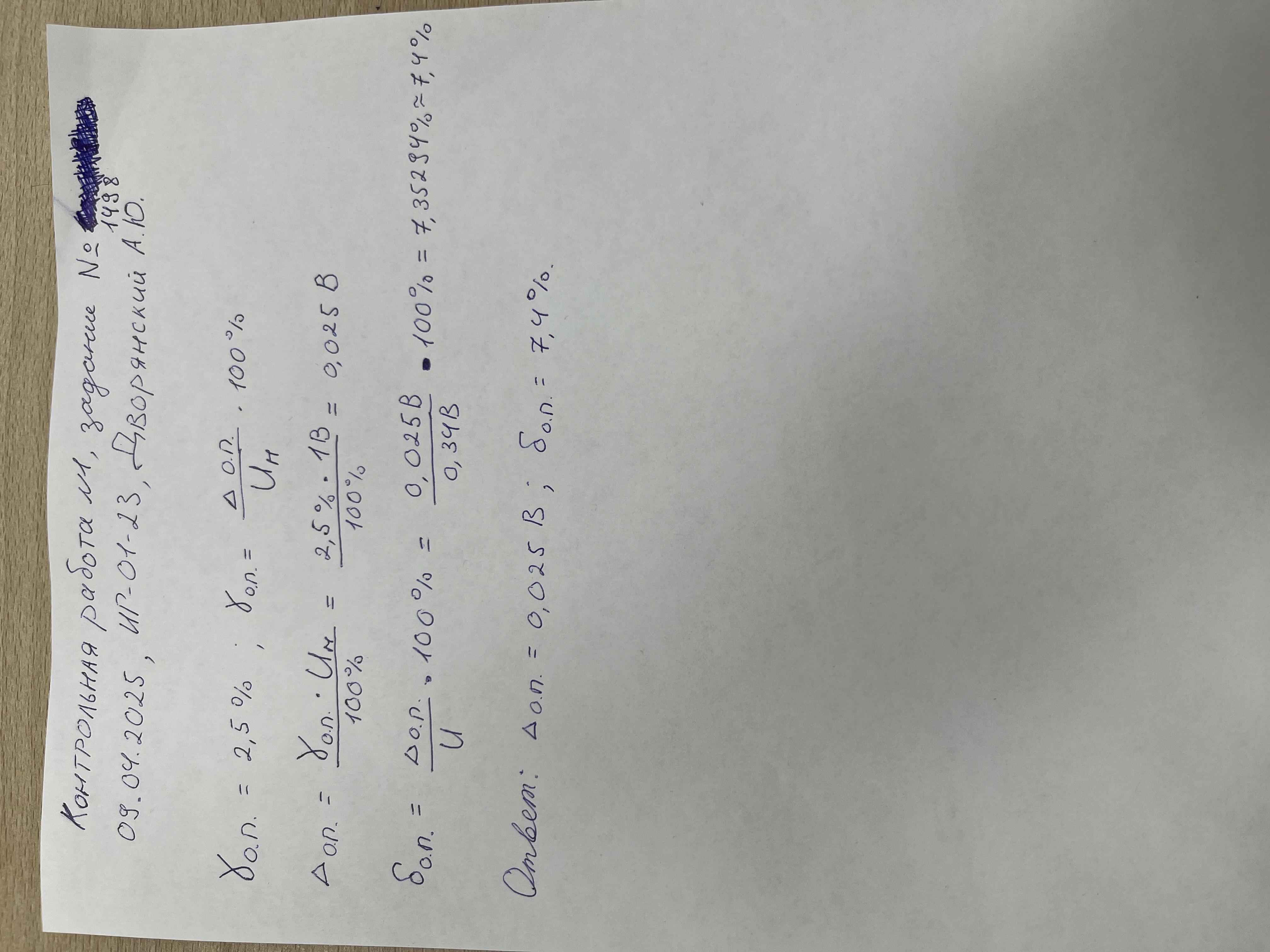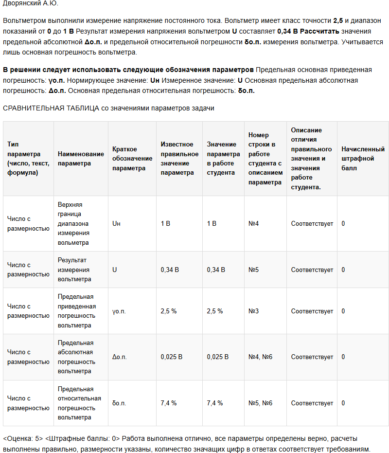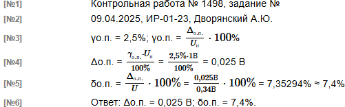 | Вольтметром выполнили измерение напряжение постоянного тока. Вольтметр имеет класс точности 2,5 и диапазон показаний от 0 до 1 В Результат измерения напряжения вольтметром U составляет 0,34 В Рассчитать значения предельной абсолютной Δо.п. и предельной относительной погрешности δо.п. измерения вольтметра. Учитывается лишь основная погрешность вольтметра. В решении следует использовать следующие обозначения параметров Предельная основная приведенная погрешность: γо.п. Нормирующее значение: Uн Измеренное значение: U Основная предельная абсолютная погрешность: Δо.п. Основная предельная относительная погрешность: δо.п. |