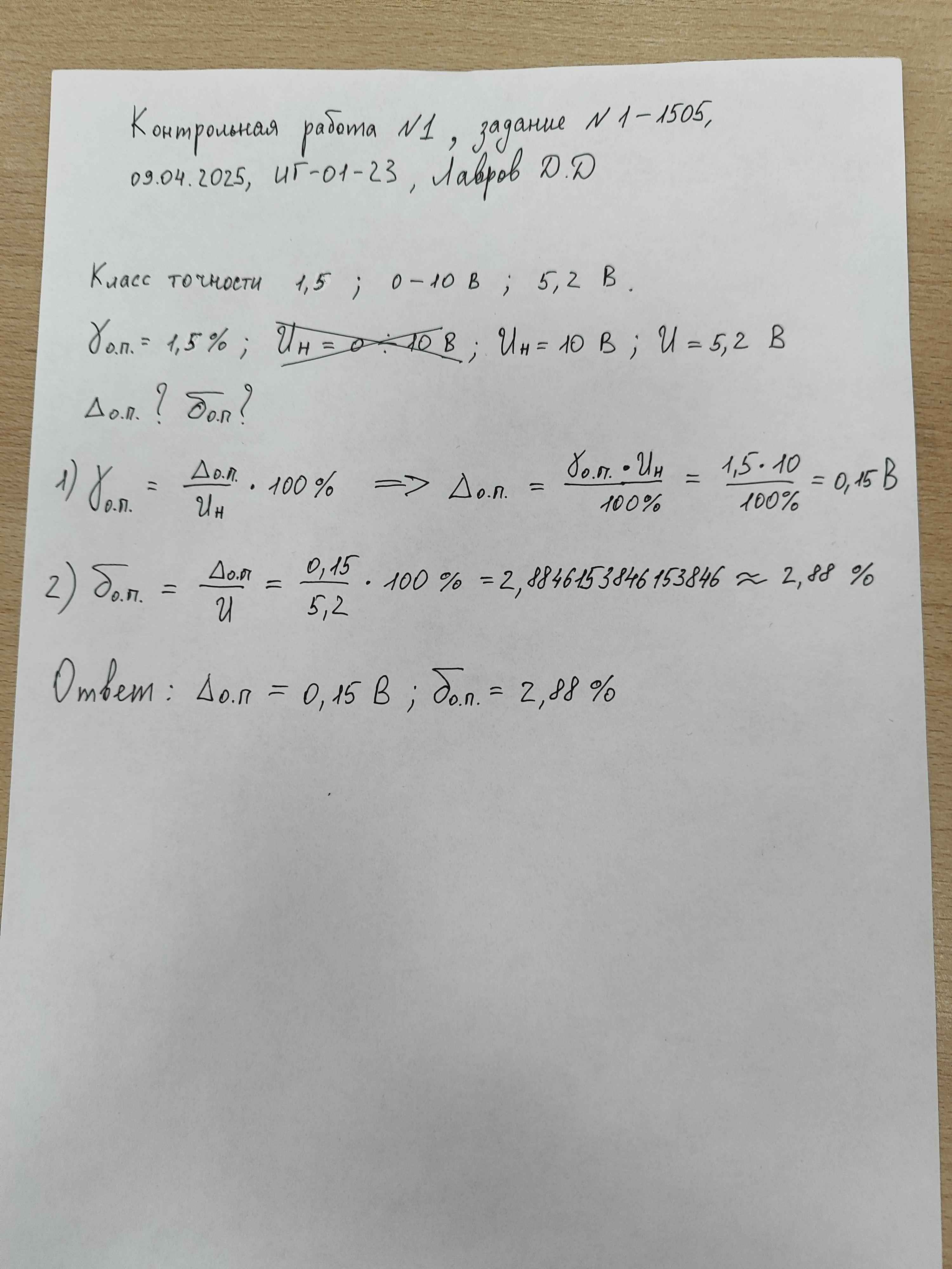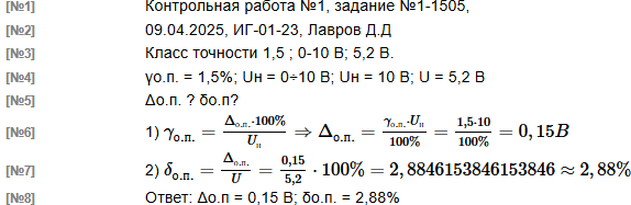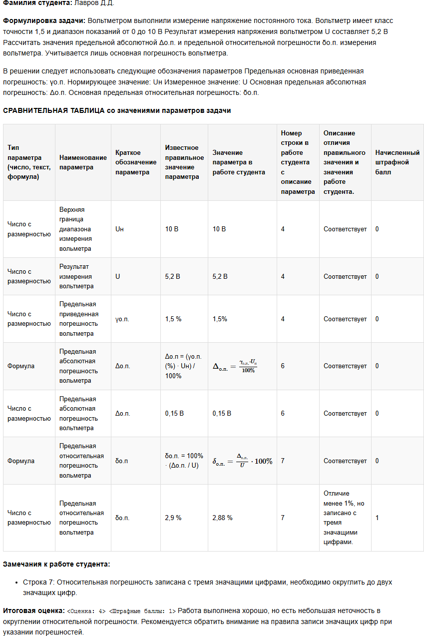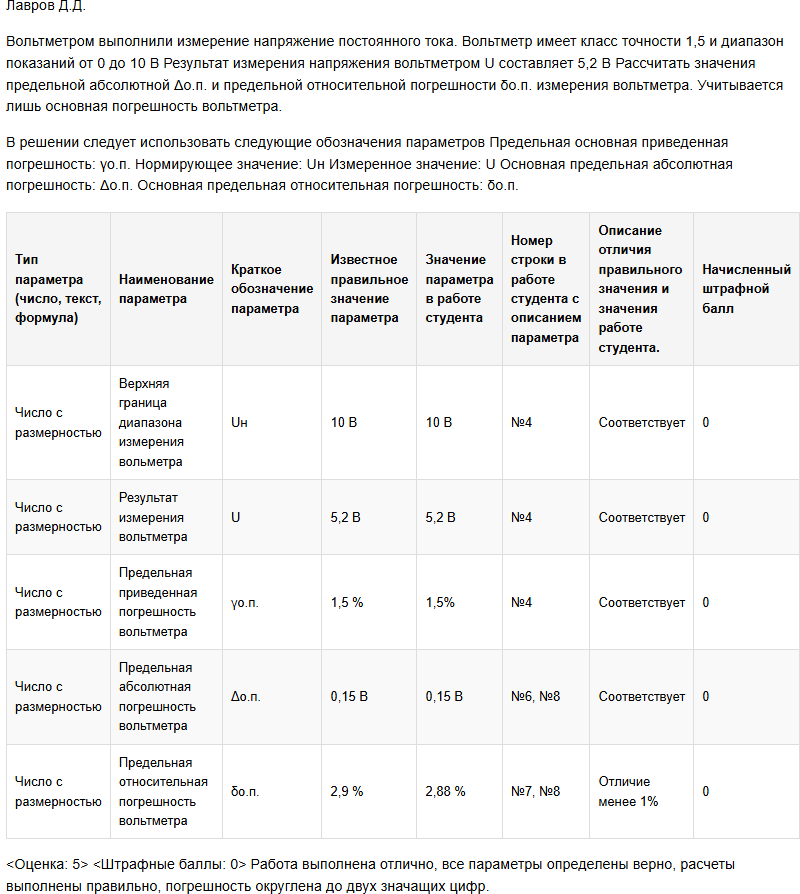 | Вольтметром выполнили измерение напряжение постоянного тока. Вольтметр имеет класс точности 1,5 и диапазон показаний от 0 до 10 В Результат измерения напряжения вольтметром U составляет 5,2 В Рассчитать значения предельной абсолютной Δо.п. и предельной относительной погрешности δо.п. измерения вольтметра. Учитывается лишь основная погрешность вольтметра. В решении следует использовать следующие обозначения параметров Предельная основная приведенная погрешность: γо.п. Нормирующее значение: Uн Измеренное значение: U Основная предельная абсолютная погрешность: Δо.п. Основная предельная относительная погрешность: δо.п. |