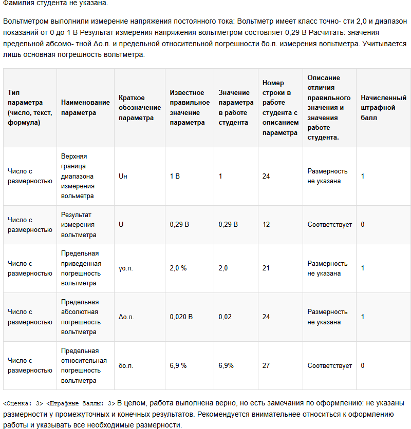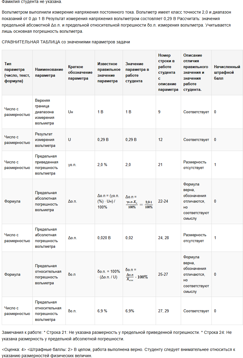 | Вольтметром выполнили измерение напряжение постоянного тока. Вольтметр имеет класс точности 2,0 и диапазон показаний от 0 до 1 В Результат измерения напряжения вольтметром U составляет 0,29 В Рассчитать значения предельной абсолютной Δо.п. и предельной относительной погрешности δо.п. измерения вольтметра. Учитывается лишь основная погрешность вольтметра. В решении следует использовать следующие обозначения параметров Предельная основная приведенная погрешность: γо.п. Нормирующее значение: Uн Измеренное значение: U Основная предельная абсолютная погрешность: Δо.п. Основная предельная относительная погрешность: δо.п. |