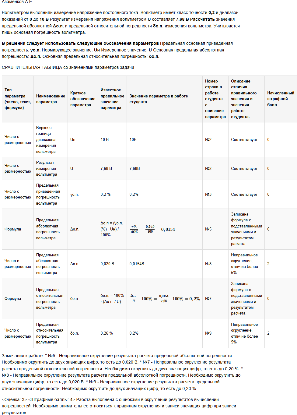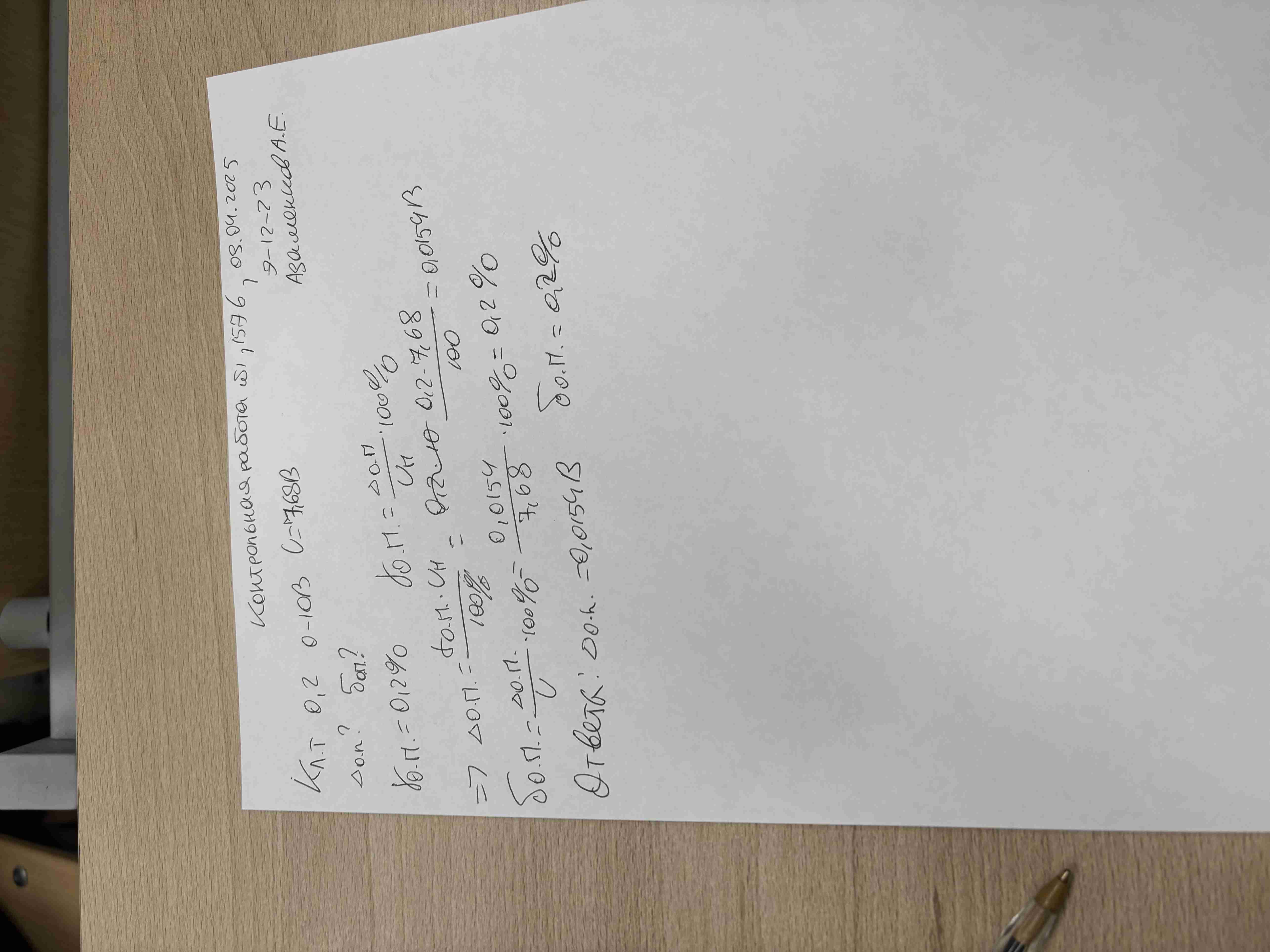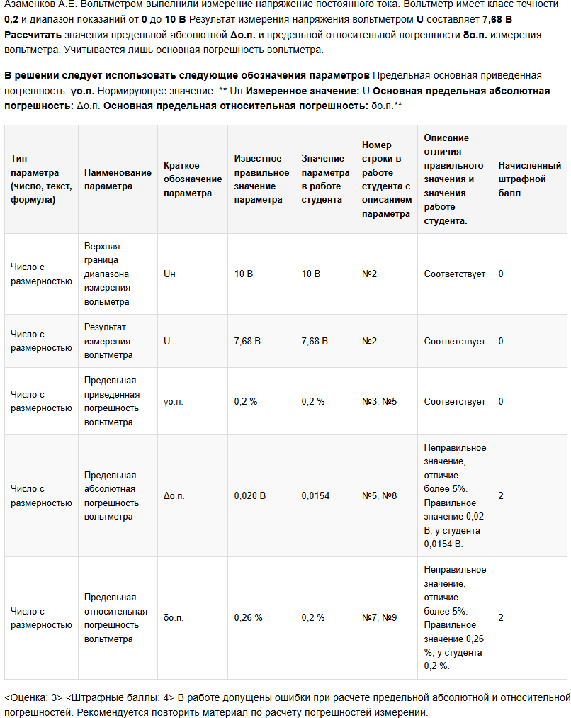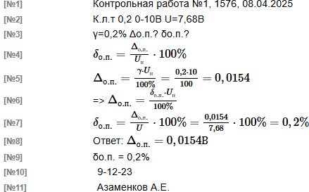 | Вольтметром выполнили измерение напряжение постоянного тока. Вольтметр имеет класс точности 0,2 и диапазон показаний от 0 до 10 В Результат измерения напряжения вольтметром U составляет 7,68 В Рассчитать значения предельной абсолютной Δо.п. и предельной относительной погрешности δо.п. измерения вольтметра. Учитывается лишь основная погрешность вольтметра. В решении следует использовать следующие обозначения параметров Предельная основная приведенная погрешность: γо.п. Нормирующее значение: Uн Измеренное значение: U Основная предельная абсолютная погрешность: Δо.п. Основная предельная относительная погрешность: δо.п. |
