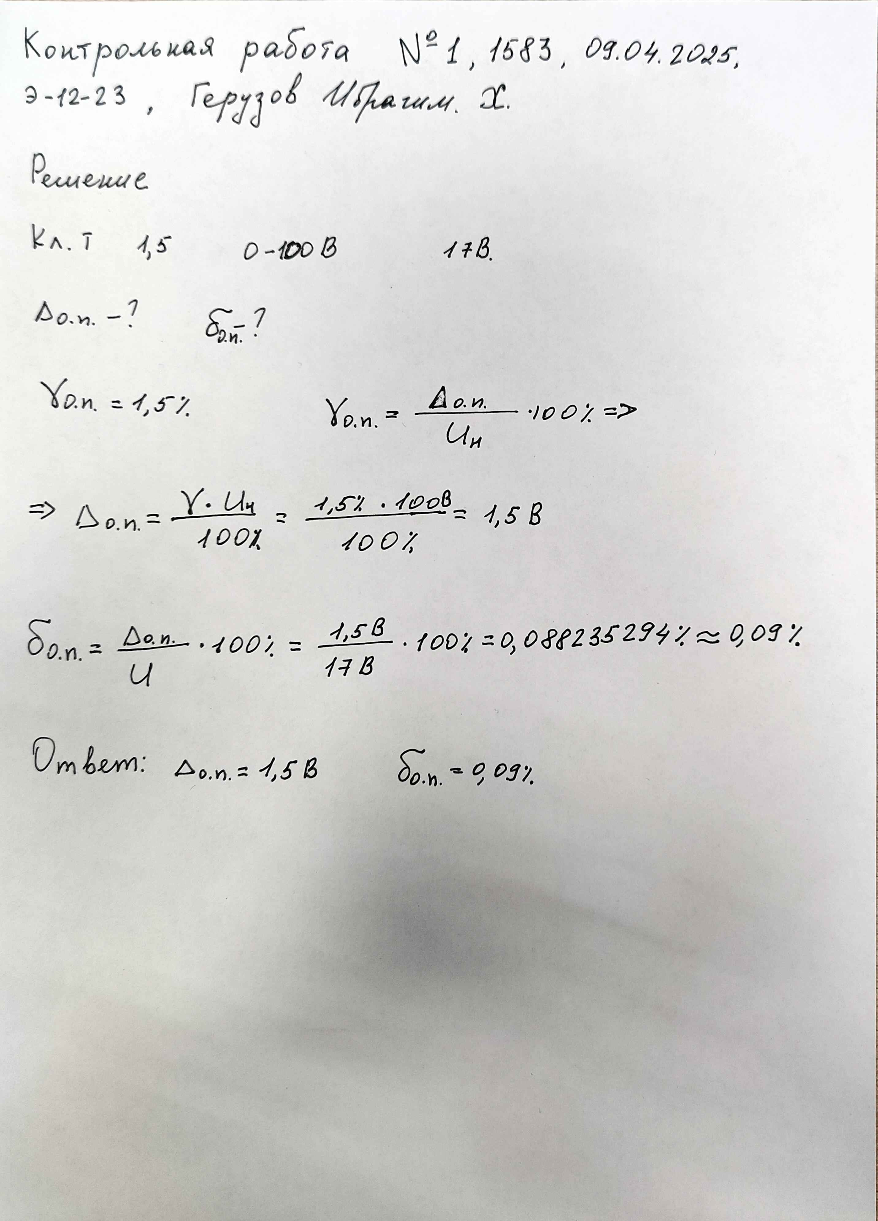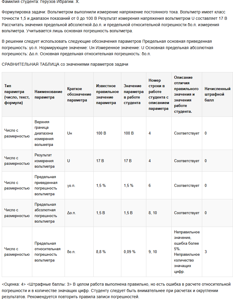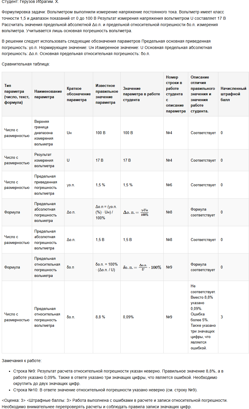 | Вольтметром выполнили измерение напряжение постоянного тока. Вольтметр имеет класс точности 1,5 и диапазон показаний от 0 до 100 В Результат измерения напряжения вольтметром U составляет 17 В Рассчитать значения предельной абсолютной Δо.п. и предельной относительной погрешности δо.п. измерения вольтметра. Учитывается лишь основная погрешность вольтметра. В решении следует использовать следующие обозначения параметров Предельная основная приведенная погрешность: γо.п. Нормирующее значение: Uн Измеренное значение: U Основная предельная абсолютная погрешность: Δо.п. Основная предельная относительная погрешность: δо.п. |