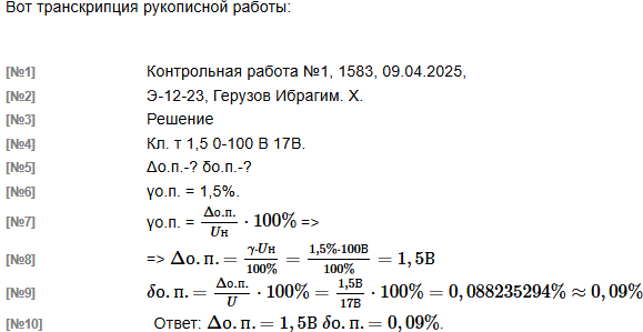 | Коррекция результата распознавания . Если необходима коррекция результата распознавания, подготовьте фото корректируемых строк согласно правилам выполнения работы и затем со своего почтового ящика ОСЭП отправьте письмо на адрес dit-mpei-06@exam-edu.ru с темой письма Re: Метрология, КР № 1 РАСПОЗНАВАНИЕ [задание № 1~1583~] и пустым текстом письма. К письму обязательно ПРИЛОЖИТЕ только фото корректируемых строк. Через 5..7 минут в Ваш почтовый ящик придет письмо с откорректированным результатом распознавания текста рукописи. |
