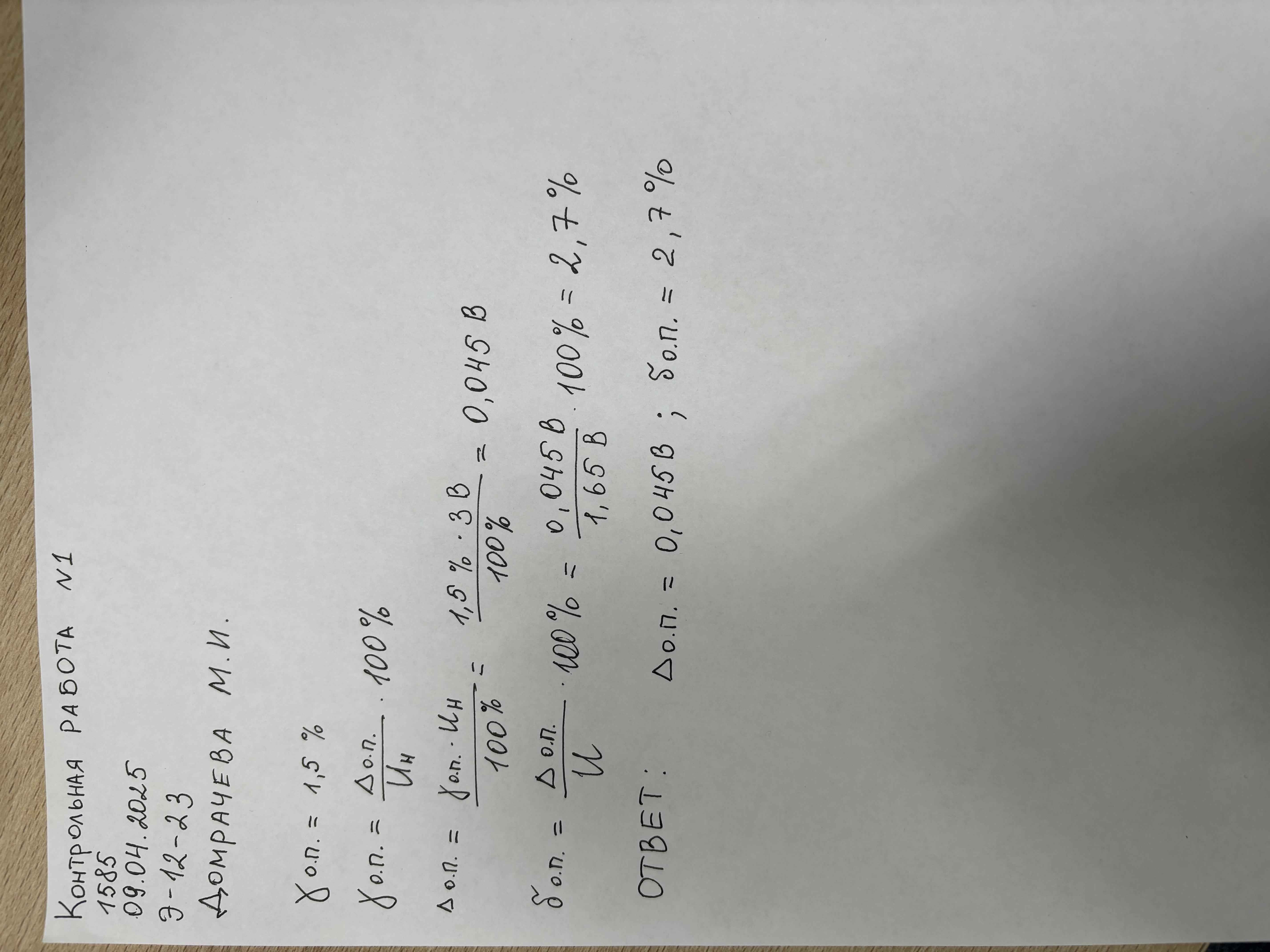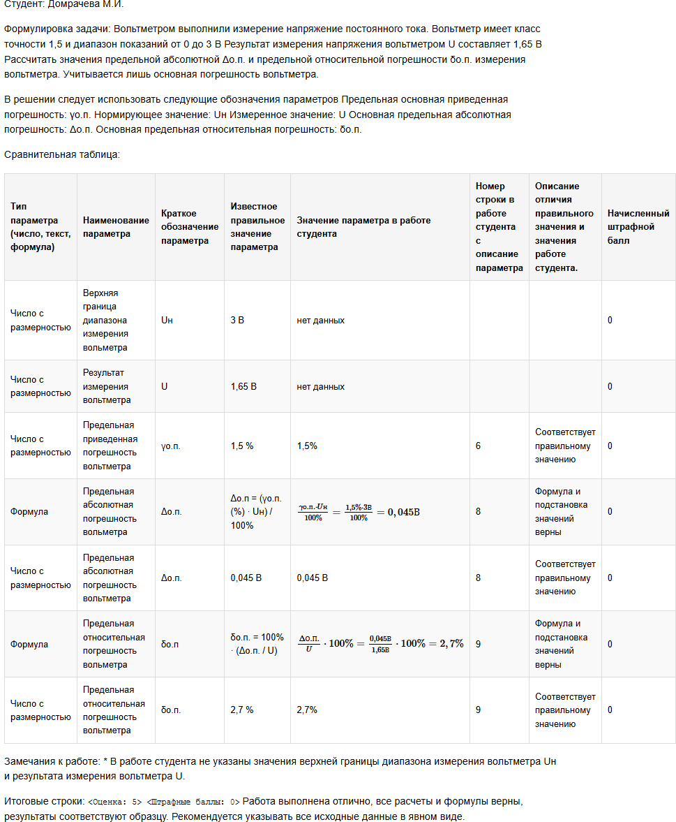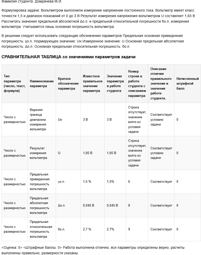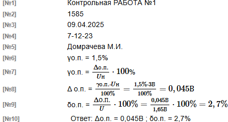 | Вольтметром выполнили измерение напряжение постоянного тока. Вольтметр имеет класс точности 1,5 и диапазон показаний от 0 до 3 В Результат измерения напряжения вольтметром U составляет 1,65 В Рассчитать значения предельной абсолютной Δо.п. и предельной относительной погрешности δо.п. измерения вольтметра. Учитывается лишь основная погрешность вольтметра. В решении следует использовать следующие обозначения параметров Предельная основная приведенная погрешность: γо.п. Нормирующее значение: Uн Измеренное значение: U Основная предельная абсолютная погрешность: Δо.п. Основная предельная относительная погрешность: δо.п. |