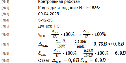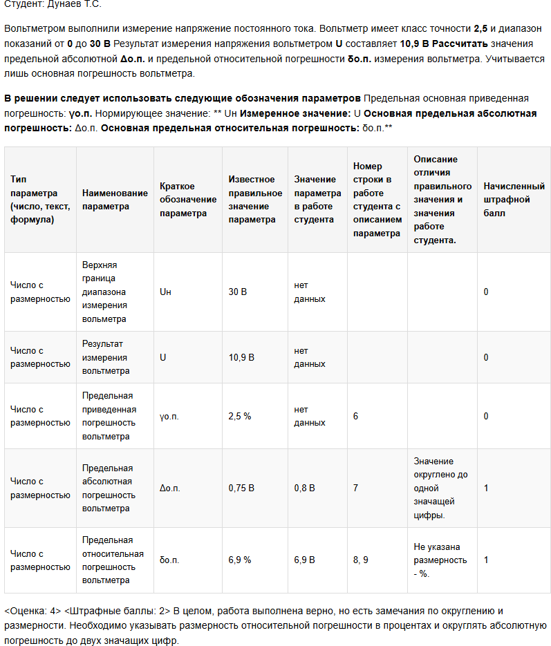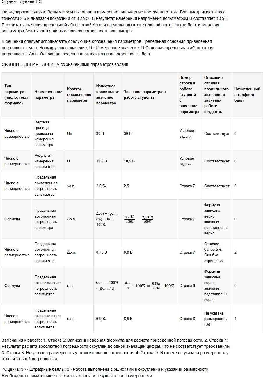 | Вольтметром выполнили измерение напряжение постоянного тока. Вольтметр имеет класс точности 2,5 и диапазон показаний от 0 до 30 В Результат измерения напряжения вольтметром U составляет 10,9 В Рассчитать значения предельной абсолютной Δо.п. и предельной относительной погрешности δо.п. измерения вольтметра. Учитывается лишь основная погрешность вольтметра. В решении следует использовать следующие обозначения параметров Предельная основная приведенная погрешность: γо.п. Нормирующее значение: Uн Измеренное значение: U Основная предельная абсолютная погрешность: Δо.п. Основная предельная относительная погрешность: δо.п. |