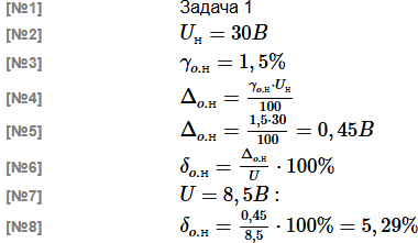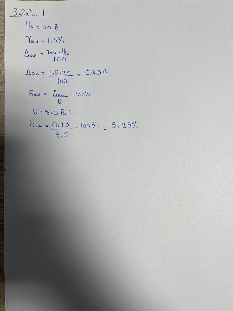 | Вольтметром выполнили измерение напряжение постоянного тока. Вольтметр имеет класс точности 1,5 и диапазон показаний от 0 до 30 В Результат измерения напряжения вольтметром U составляет 8,5 В Рассчитать значения предельной абсолютной Δо.п. и предельной относительной погрешности δо.п. измерения вольтметра. Учитывается лишь основная погрешность вольтметра. В решении следует использовать следующие обозначения параметров Предельная основная приведенная погрешность: γо.п. Нормирующее значение: Uн Измеренное значение: U Основная предельная абсолютная погрешность: Δо.п. Основная предельная относительная погрешность: δо.п. |