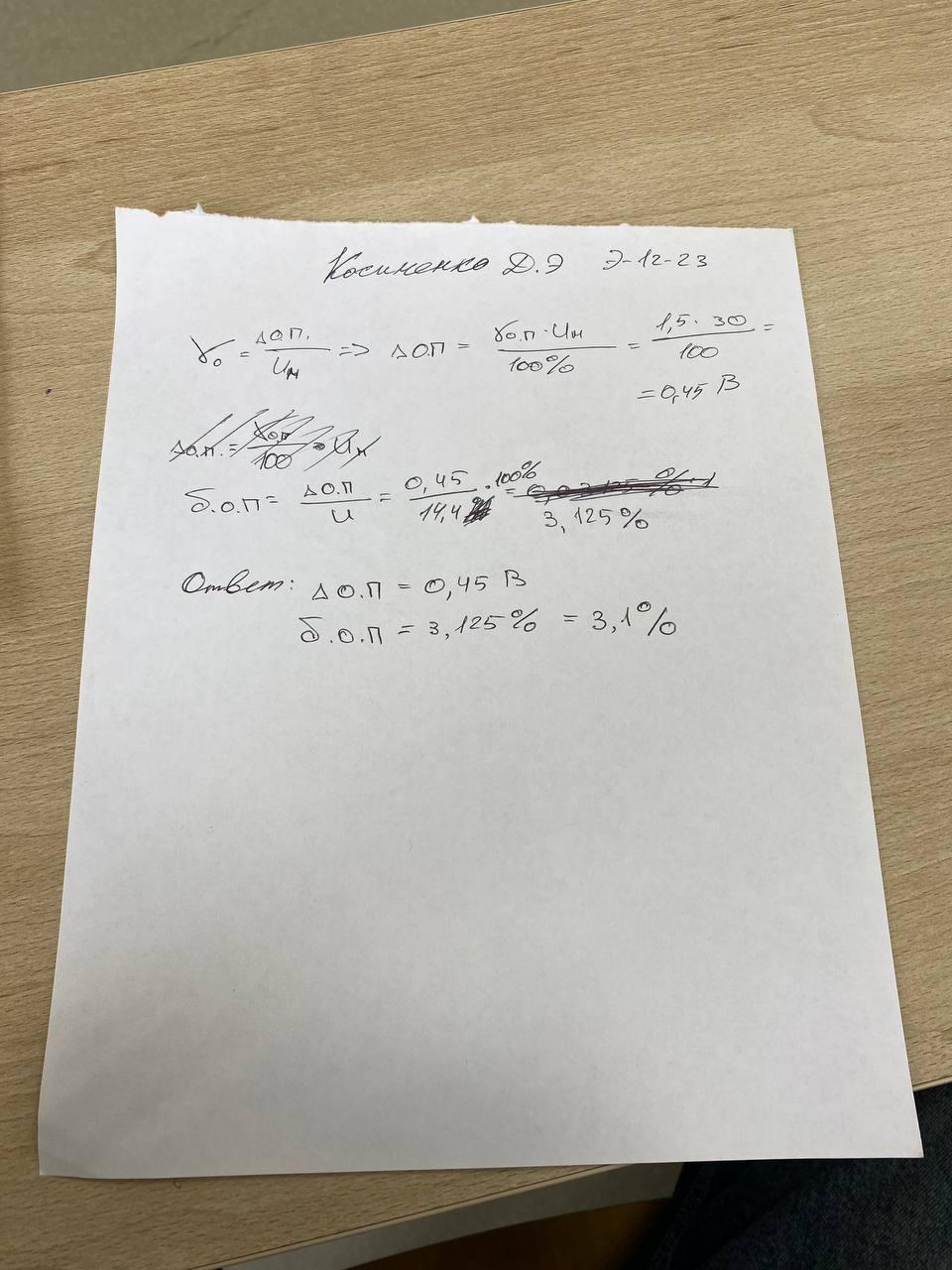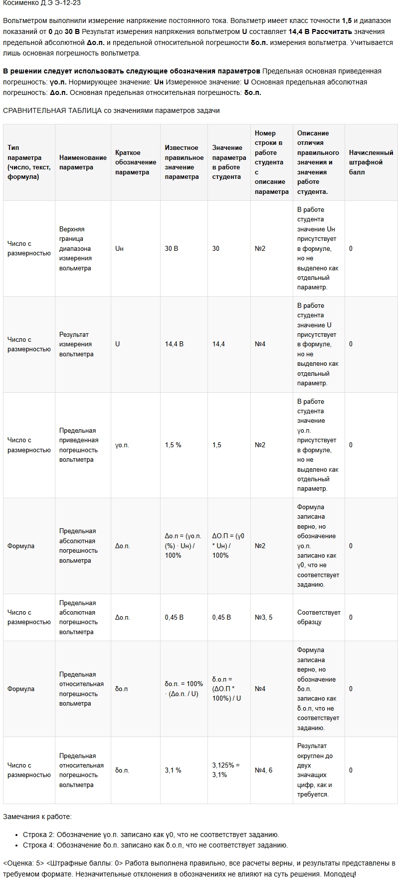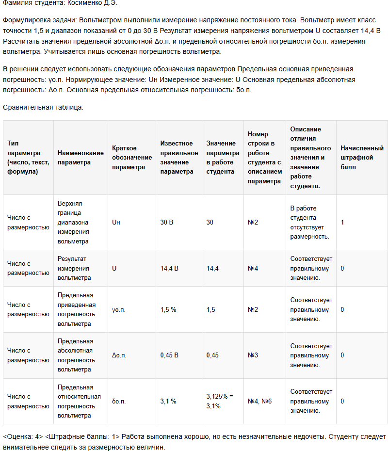 | Вольтметром выполнили измерение напряжение постоянного тока. Вольтметр имеет класс точности 1,5 и диапазон показаний от 0 до 30 В Результат измерения напряжения вольтметром U составляет 14,4 В Рассчитать значения предельной абсолютной Δо.п. и предельной относительной погрешности δо.п. измерения вольтметра. Учитывается лишь основная погрешность вольтметра. В решении следует использовать следующие обозначения параметров Предельная основная приведенная погрешность: γо.п. Нормирующее значение: Uн Измеренное значение: U Основная предельная абсолютная погрешность: Δо.п. Основная предельная относительная погрешность: δо.п. |