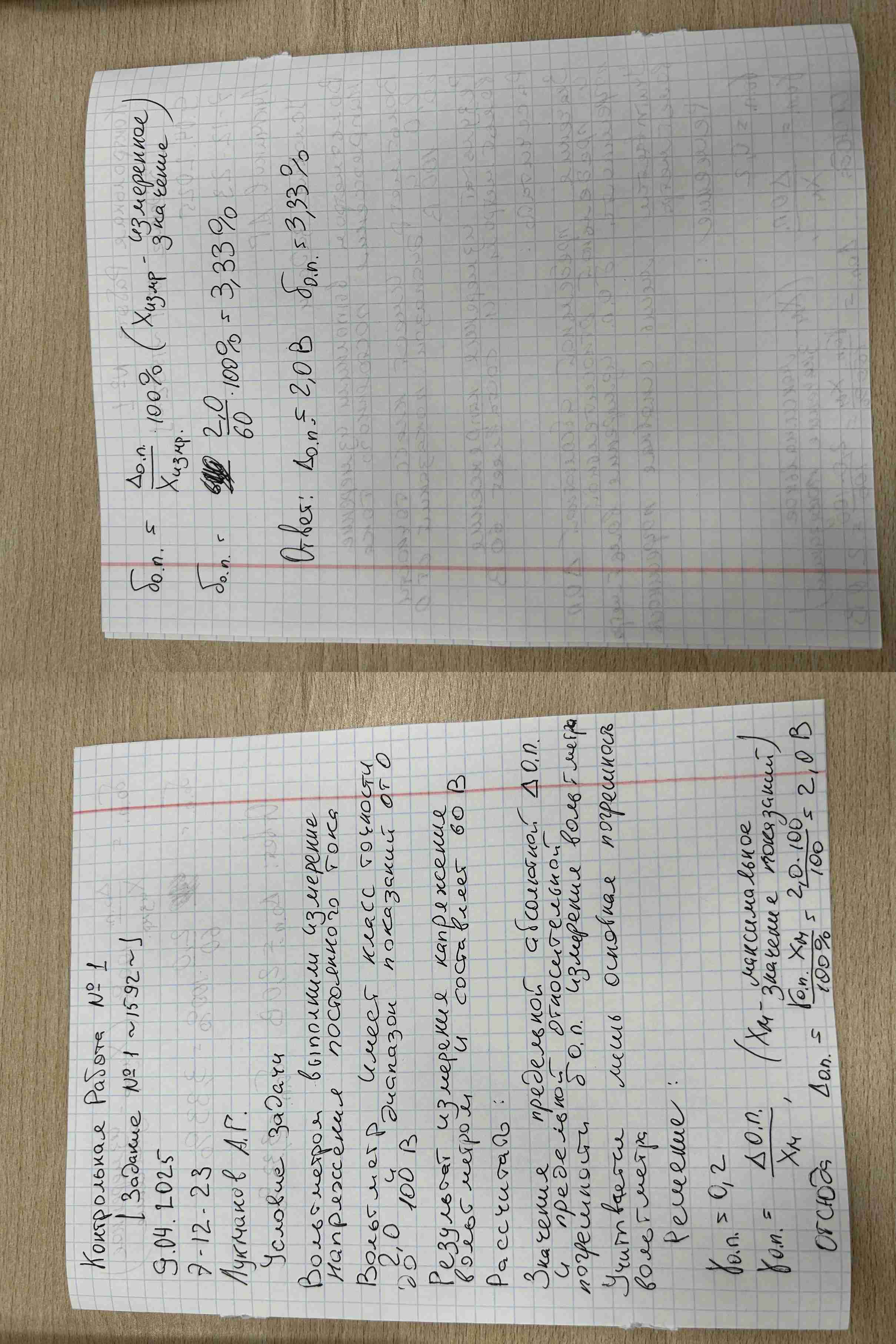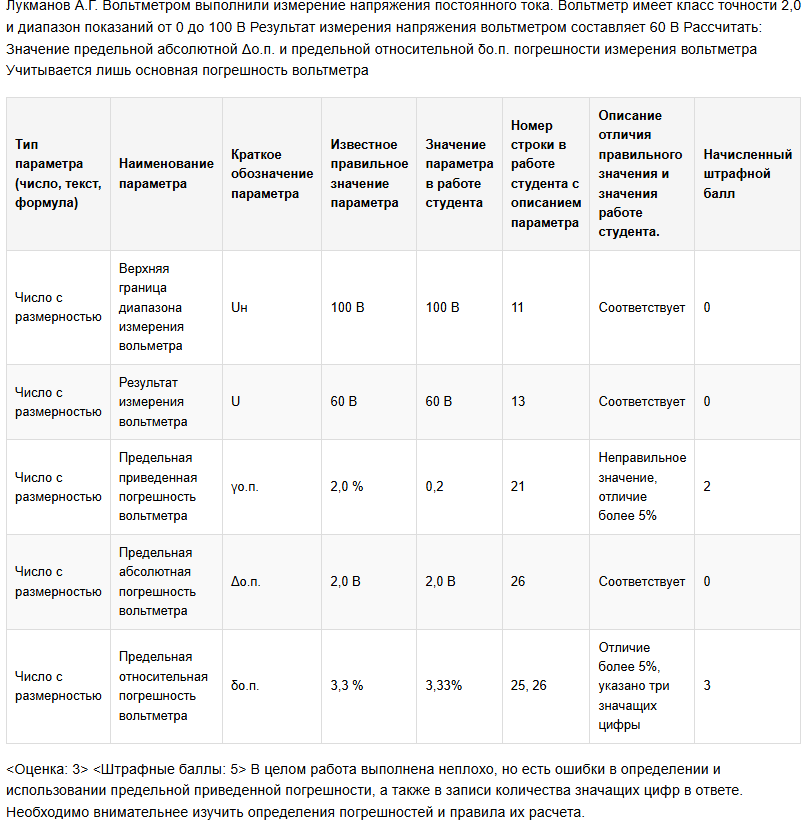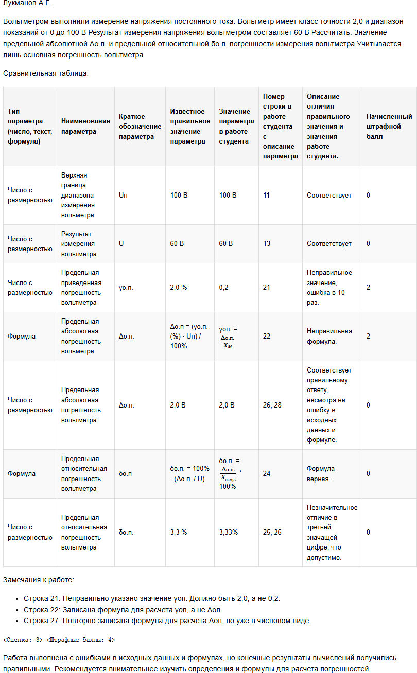 | Вольтметром выполнили измерение напряжение постоянного тока. Вольтметр имеет класс точности 2,0 и диапазон показаний от 0 до 100 В Результат измерения напряжения вольтметром U составляет 60 В Рассчитать значения предельной абсолютной Δо.п. и предельной относительной погрешности δо.п. измерения вольтметра. Учитывается лишь основная погрешность вольтметра. В решении следует использовать следующие обозначения параметров Предельная основная приведенная погрешность: γо.п. Нормирующее значение: Uн Измеренное значение: U Основная предельная абсолютная погрешность: Δо.п. Основная предельная относительная погрешность: δо.п. |
