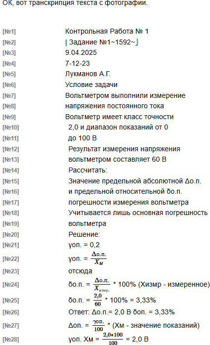 | Коррекция результата распознавания . Если необходима коррекция результата распознавания, подготовьте фото корректируемых строк согласно правилам выполнения работы и затем со своего почтового ящика ОСЭП отправьте письмо на адрес dit-mpei-05@exam-edu.ru с темой письма Re: Метрология, КР № 1 РАСПОЗНАВАНИЕ [задание № 1~1592~] и пустым текстом письма. К письму обязательно ПРИЛОЖИТЕ только фото корректируемых строк. Через 5..7 минут в Ваш почтовый ящик придет письмо с откорректированным результатом распознавания текста рукописи. |