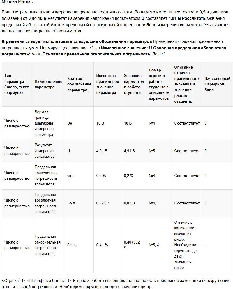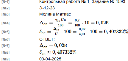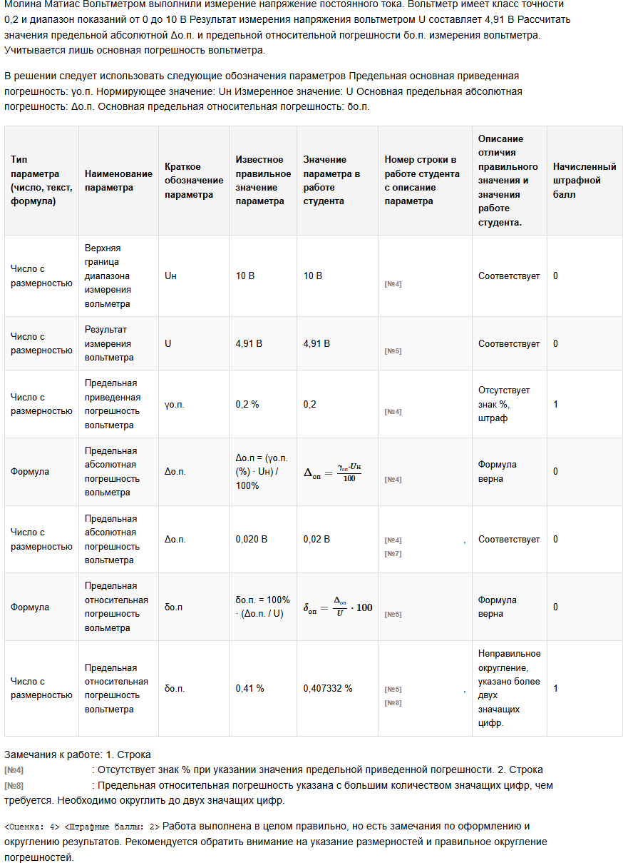 | Вольтметром выполнили измерение напряжение постоянного тока. Вольтметр имеет класс точности 0,2 и диапазон показаний от 0 до 10 В Результат измерения напряжения вольтметром U составляет 4,91 В Рассчитать значения предельной абсолютной Δо.п. и предельной относительной погрешности δо.п. измерения вольтметра. Учитывается лишь основная погрешность вольтметра. В решении следует использовать следующие обозначения параметров Предельная основная приведенная погрешность: γо.п. Нормирующее значение: Uн Измеренное значение: U Основная предельная абсолютная погрешность: Δо.п. Основная предельная относительная погрешность: δо.п. |