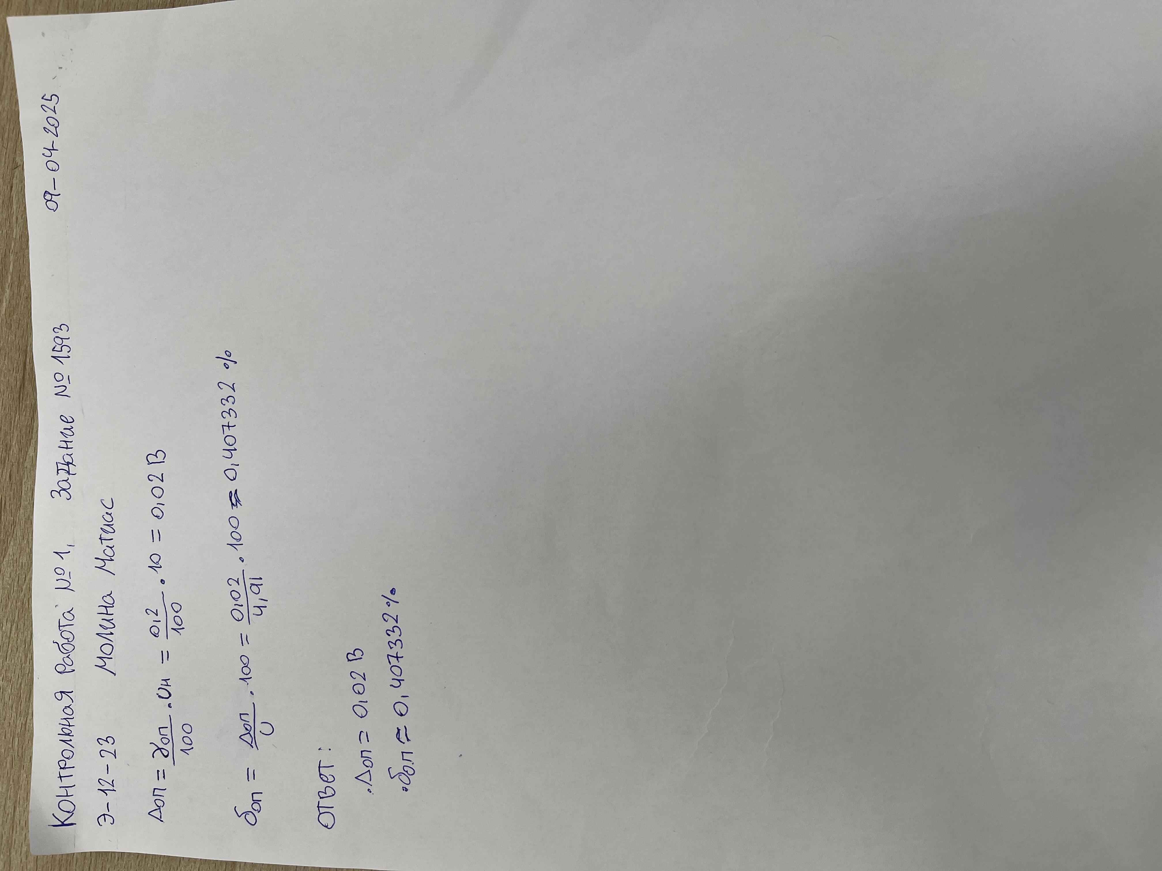 | Передача решения в систему. На нелинованном листе бумаги напишите текст решения, сфотографируйте работу согласно правилам выполнения работы. Cо своего почтового ящика ОСЭП отправьте письмо на адрес dit-mpei-06@exam-edu.ru с темой письма Re: Метрология, КР № 1 [задание № 1~1593~] и пустым текстом письма. К письму обязательно ПРИЛОЖИТЕ фото рукописи. Через 5..7 минут в Ваш почтовый ящик придет письмо с результатом распознавания текста рукописи. |