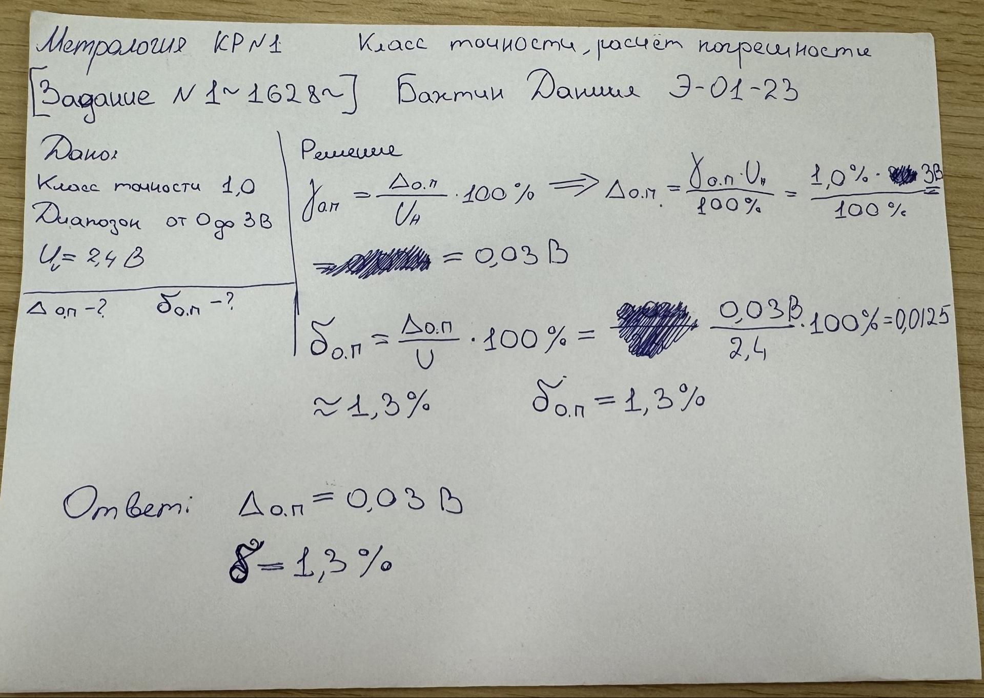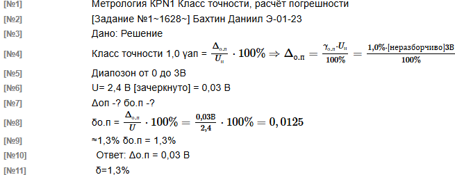 | Вольтметром выполнили измерение напряжение постоянного тока. Вольтметр имеет класс точности 1,0 и диапазон показаний от 0 до 3 В Результат измерения напряжения вольтметром U составляет 2,4 В Рассчитать значения предельной абсолютной Δо.п. и предельной относительной погрешности δо.п. измерения вольтметра. Учитывается лишь основная погрешность вольтметра. В решении следует использовать следующие обозначения параметров Предельная основная приведенная погрешность: γо.п. Нормирующее значение: Uн Измеренное значение: U Основная предельная абсолютная погрешность: Δо.п. Основная предельная относительная погрешность: δо.п. |