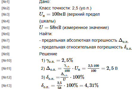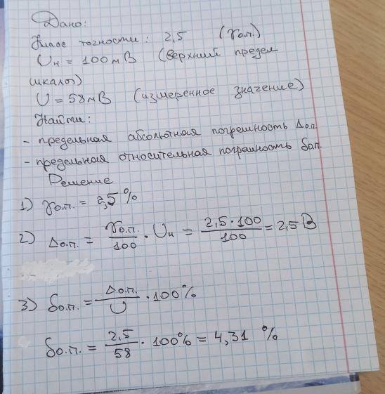 | Вольтметром выполнили измерение напряжение постоянного тока. Вольтметр имеет класс точности 2,5 и диапазон показаний от 0 до 100 мВ Результат измерения напряжения вольтметром U составляет 58 мВ Рассчитать значения предельной абсолютной Δо.п. и предельной относительной погрешности δо.п. измерения вольтметра. Учитывается лишь основная погрешность вольтметра. В решении следует использовать следующие обозначения параметров Предельная основная приведенная погрешность: γо.п. Нормирующее значение: Uн Измеренное значение: U Основная предельная абсолютная погрешность: Δо.п. Основная предельная относительная погрешность: δо.п. |