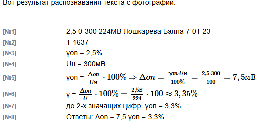 | Если необходима коррекция результата распознавания. Для коррекции результата распознавания подготовьте фото корректируемых строк (подробнее тут) и со своего почтового ящика ОСЭП отправьте письмо на адрес dit-mpei-00@exam-edu.ru с темой письма Re: Метрология, КР № 1 РАСПОЗНАВАНИЕ [задание № 1~1637~] и пустым текстом письма. К письму ПРИЛОЖИТЕ только фото корректируемых строк. Через 5..7 минут в Ваш почтовый ящик придет письмо с откорректированным результатом распознавания текста рукописи. |