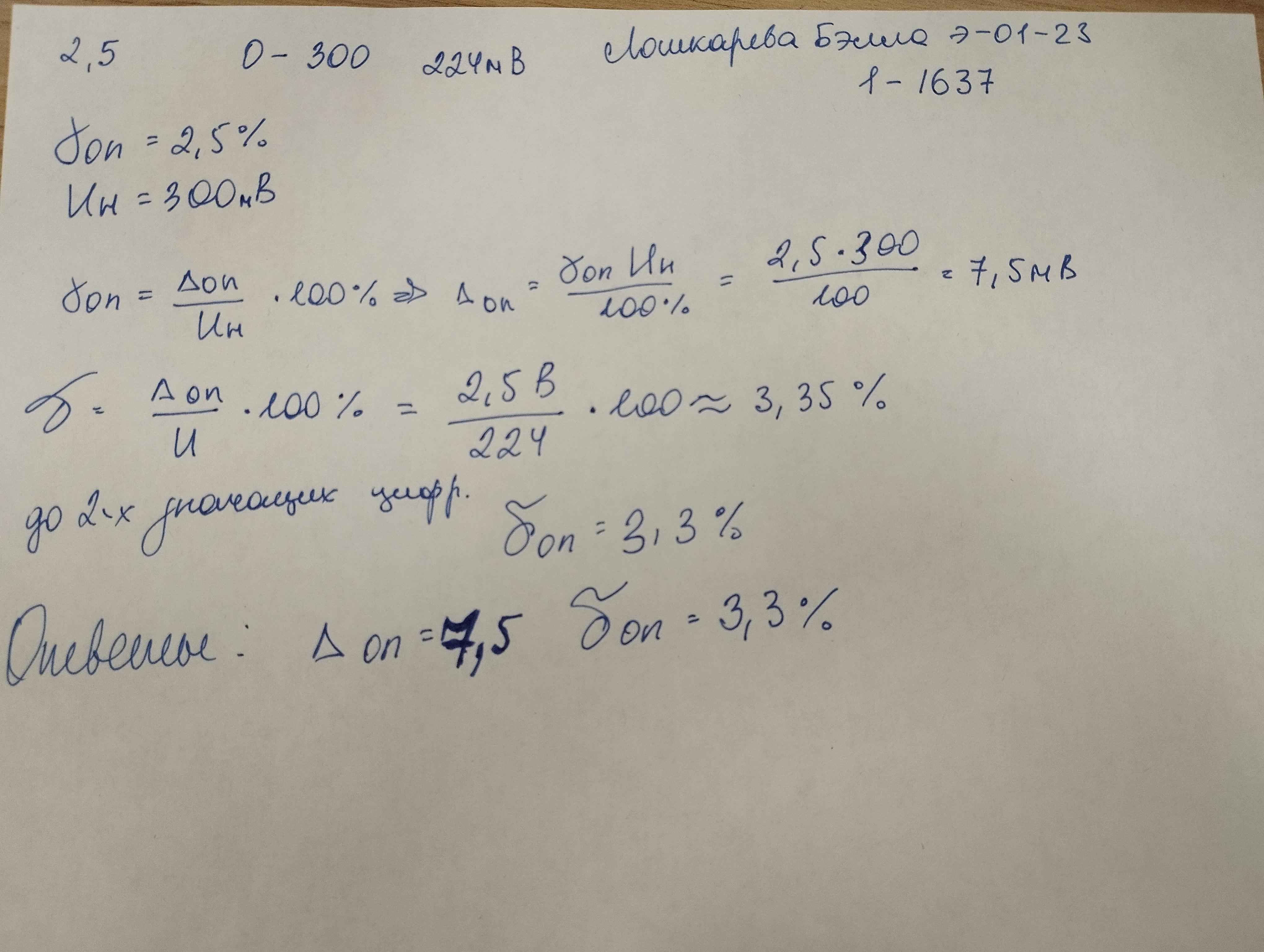 | Вольтметром выполнили измерение напряжение постоянного тока. Вольтметр имеет класс точности 2,5 и диапазон показаний от 0 до 300 мВ Результат измерения напряжения вольтметром U составляет 224 мВ Рассчитать значения предельной абсолютной Δо.п. и предельной относительной погрешности δо.п. измерения вольтметра. Учитывается лишь основная погрешность вольтметра. В решении следует использовать следующие обозначения параметров Предельная основная приведенная погрешность: γо.п. Нормирующее значение: Uн Измеренное значение: U Основная предельная абсолютная погрешность: Δо.п. Основная предельная относительная погрешность: δо.п. |