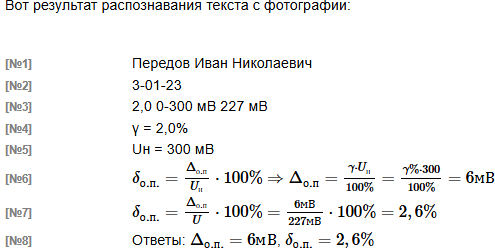 | Если необходима коррекция результата распознавания. Для коррекции результата распознавания подготовьте фото корректируемых строк (подробнее тут) и со своего почтового ящика ОСЭП отправьте письмо на адрес dit-mpei-06@exam-edu.ru с темой письма Re: Метрология, КР № 1 РАСПОЗНАВАНИЕ [задание № 1~1643~] и пустым текстом письма. К письму ПРИЛОЖИТЕ только фото корректируемых строк. Через 5..7 минут в Ваш почтовый ящик придет письмо с откорректированным результатом распознавания текста рукописи. |