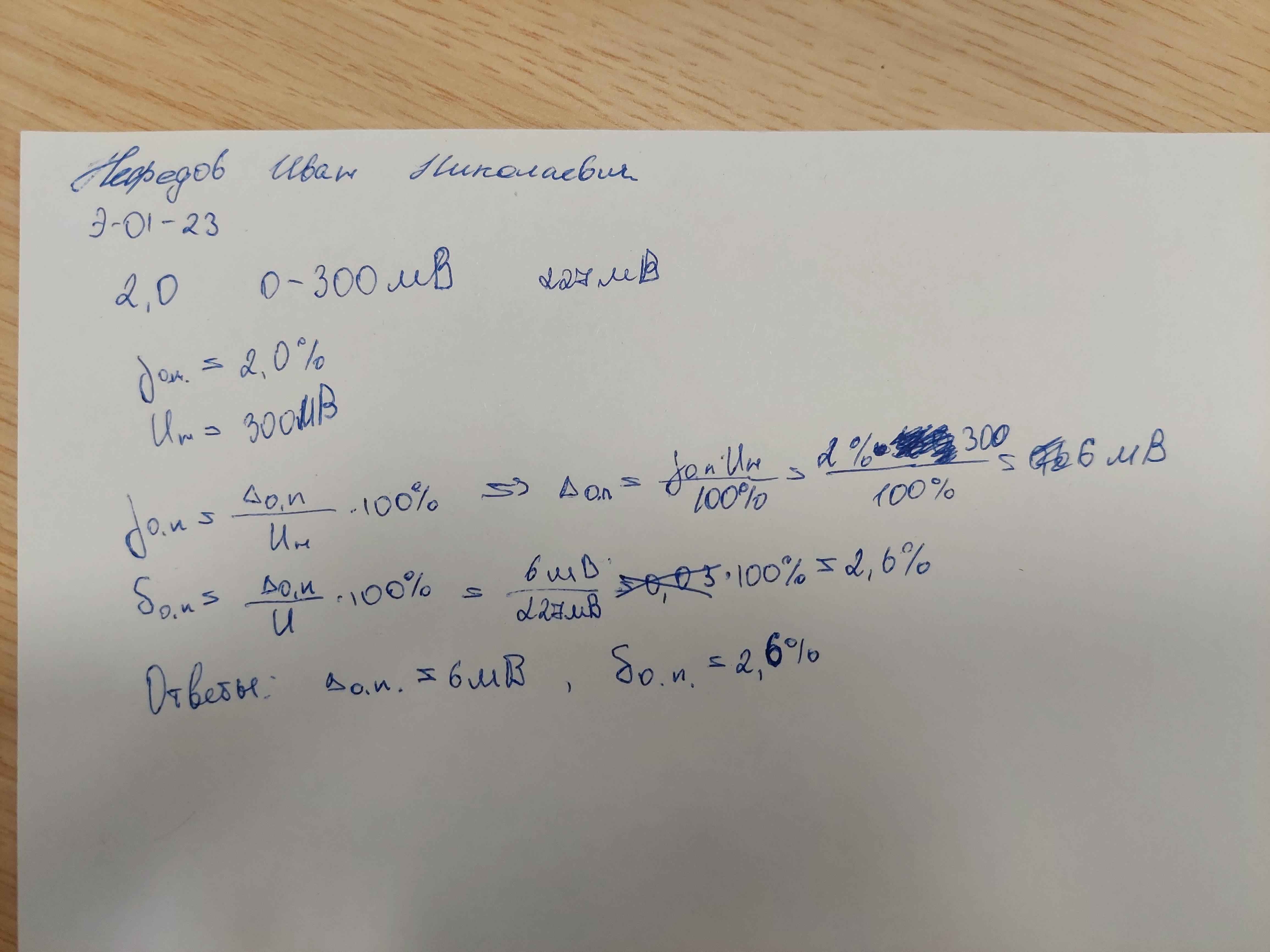 | Вольтметром выполнили измерение напряжение постоянного тока. Вольтметр имеет класс точности 2,0 и диапазон показаний от 0 до 300 мВ Результат измерения напряжения вольтметром U составляет 227 мВ Рассчитать значения предельной абсолютной Δо.п. и предельной относительной погрешности δо.п. измерения вольтметра. Учитывается лишь основная погрешность вольтметра. В решении следует использовать следующие обозначения параметров Предельная основная приведенная погрешность: γо.п. Нормирующее значение: Uн Измеренное значение: U Основная предельная абсолютная погрешность: Δо.п. Основная предельная относительная погрешность: δо.п. |
