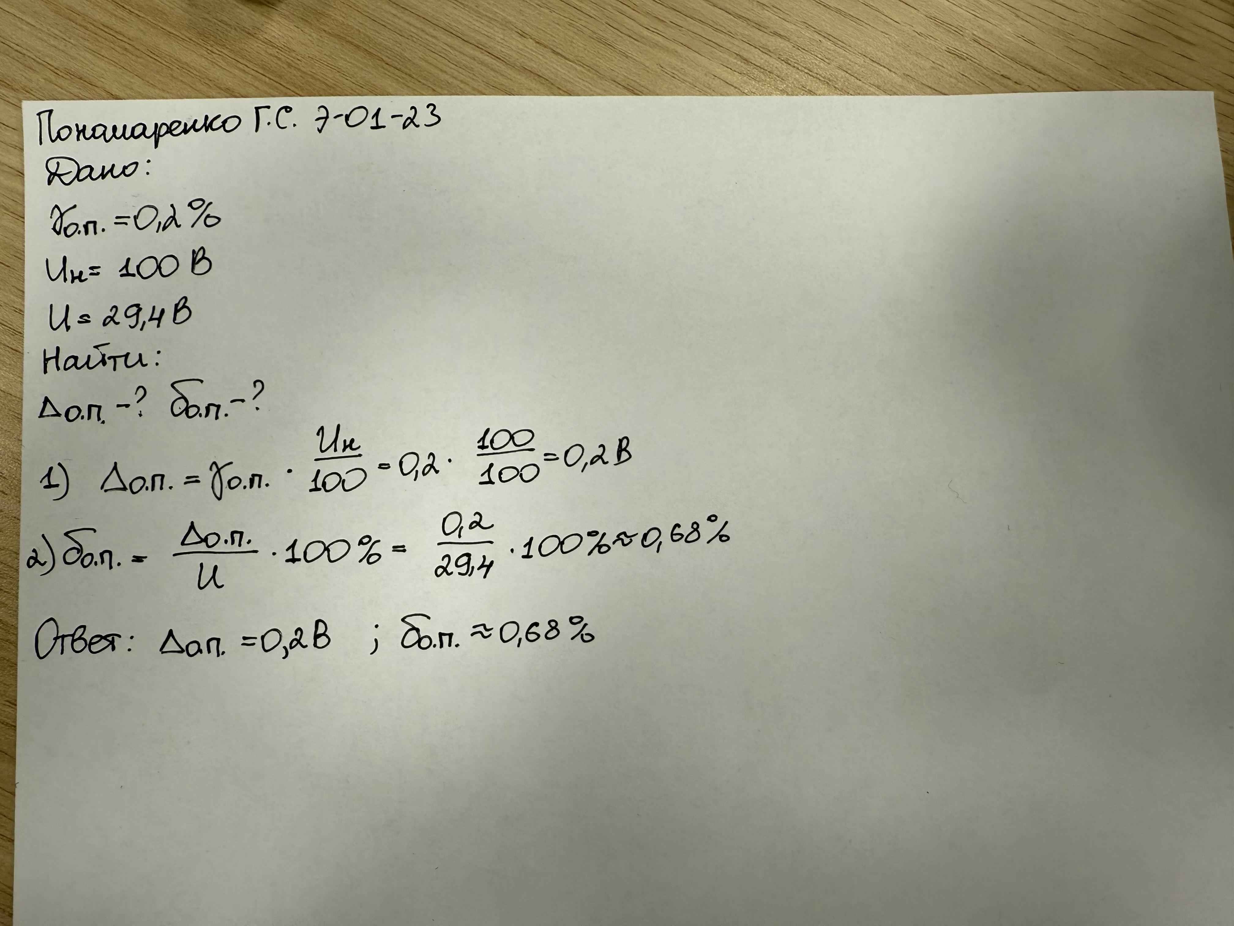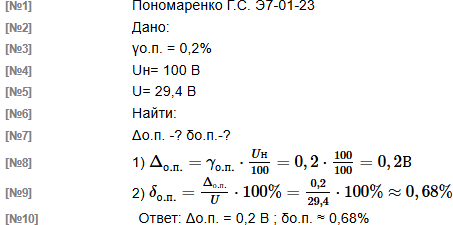 | Вольтметром выполнили измерение напряжение постоянного тока. Вольтметр имеет класс точности 0,2 и диапазон показаний от 0 до 100 В Результат измерения напряжения вольтметром U составляет 29,4 В Рассчитать значения предельной абсолютной Δо.п. и предельной относительной погрешности δо.п. измерения вольтметра. Учитывается лишь основная погрешность вольтметра. В решении следует использовать следующие обозначения параметров Предельная основная приведенная погрешность: γо.п. Нормирующее значение: Uн Измеренное значение: U Основная предельная абсолютная погрешность: Δо.п. Основная предельная относительная погрешность: δо.п. |