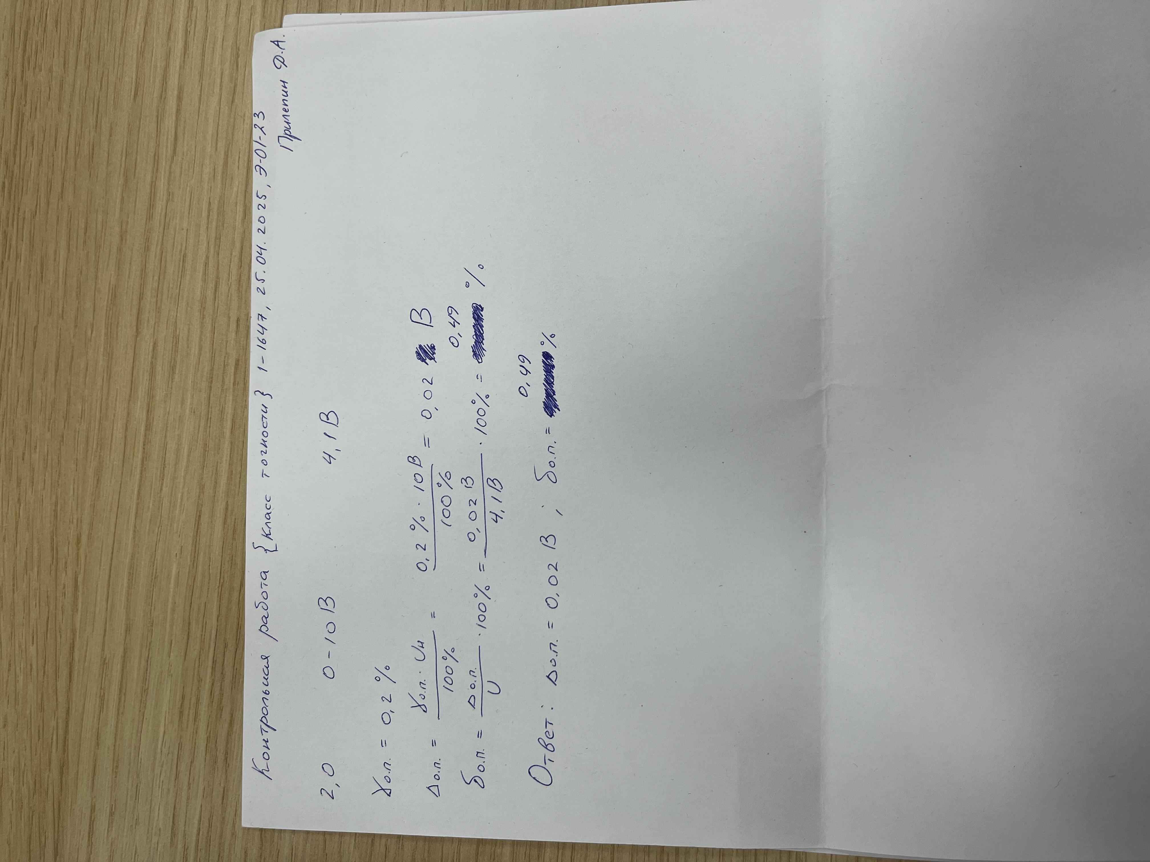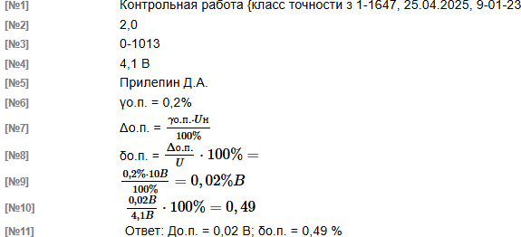 | Вольтметром выполнили измерение напряжение постоянного тока. Вольтметр имеет класс точности 0,2 и диапазон показаний от 0 до 10 В Результат измерения напряжения вольтметром U составляет 4,1 В Рассчитать значения предельной абсолютной Δо.п. и предельной относительной погрешности δо.п. измерения вольтметра. Учитывается лишь основная погрешность вольтметра. В решении следует использовать следующие обозначения параметров Предельная основная приведенная погрешность: γо.п. Нормирующее значение: Uн Измеренное значение: U Основная предельная абсолютная погрешность: Δо.п. Основная предельная относительная погрешность: δо.п. |