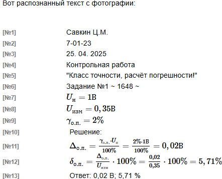 | Если необходима коррекция результата распознавания. Для коррекции результата распознавания подготовьте фото корректируемых строк (подробнее тут) и со своего почтового ящика ОСЭП отправьте письмо на адрес dit-mpei-01@exam-edu.ru с темой письма Re: Метрология, КР № 1 РАСПОЗНАВАНИЕ [задание № 1~1648~] и пустым текстом письма. К письму ПРИЛОЖИТЕ только фото корректируемых строк. Через 5..7 минут в Ваш почтовый ящик придет письмо с откорректированным результатом распознавания текста рукописи. |