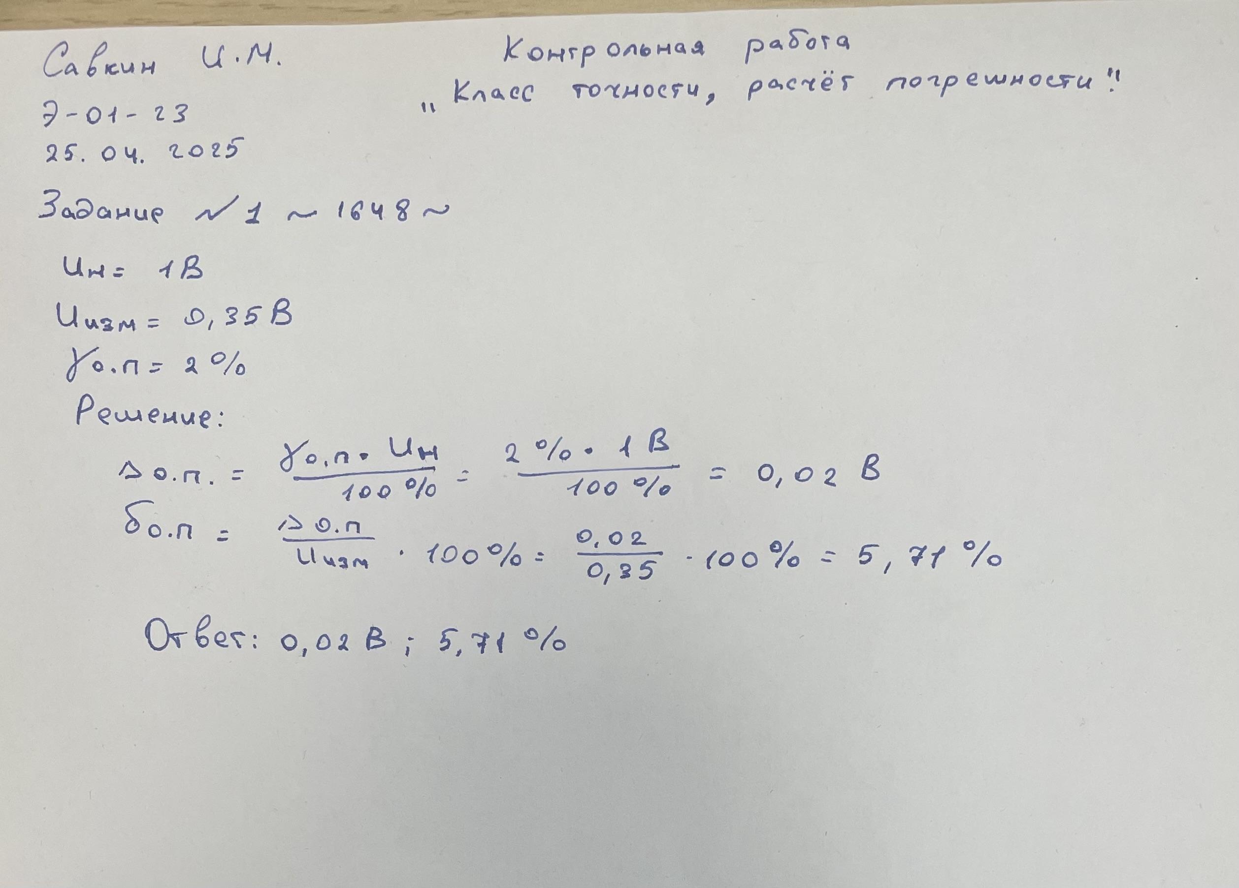| Вольтметром выполнили измерение напряжение постоянного тока. Вольтметр имеет класс точности 2,0 и диапазон показаний от 0 до 1 В Результат измерения напряжения вольтметром U составляет 0,35 В Рассчитать значения предельной абсолютной Δо.п. и предельной относительной погрешности δо.п. измерения вольтметра. Учитывается лишь основная погрешность вольтметра. В решении следует использовать следующие обозначения параметров Предельная основная приведенная погрешность: γо.п. Нормирующее значение: Uн Измеренное значение: U Основная предельная абсолютная погрешность: Δо.п. Основная предельная относительная погрешность: δо.п. |