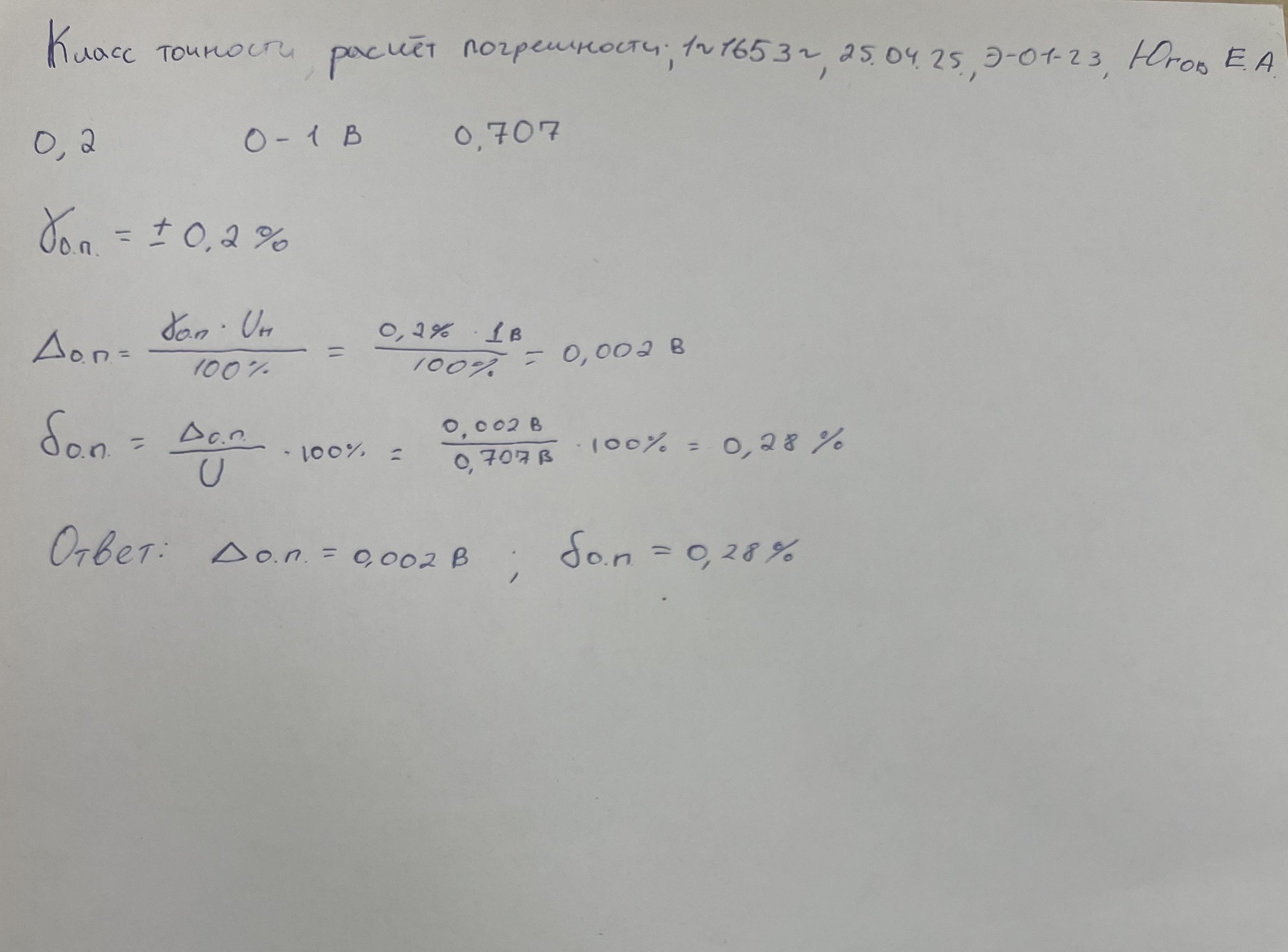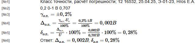 | Вольтметром выполнили измерение напряжение постоянного тока. Вольтметр имеет класс точности 0,2 и диапазон показаний от 0 до 1 В Результат измерения напряжения вольтметром U составляет 0,707 В Рассчитать значения предельной абсолютной Δо.п. и предельной относительной погрешности δо.п. измерения вольтметра. Учитывается лишь основная погрешность вольтметра. В решении следует использовать следующие обозначения параметров Предельная основная приведенная погрешность: γо.п. Нормирующее значение: Uн Измеренное значение: U Основная предельная абсолютная погрешность: Δо.п. Основная предельная относительная погрешность: δо.п. |
