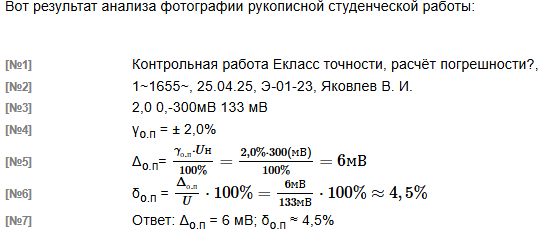 | Если необходима коррекция результата распознавания. Для коррекции результата распознавания подготовьте фото корректируемых строк (подробнее тут) и со своего почтового ящика ОСЭП отправьте письмо на адрес dit-mpei-08@exam-edu.ru с темой письма Re: Метрология, КР № 1 РАСПОЗНАВАНИЕ [задание № 1~1655~] и пустым текстом письма. К письму ПРИЛОЖИТЕ только фото корректируемых строк. Через 5..7 минут в Ваш почтовый ящик придет письмо с откорректированным результатом распознавания текста рукописи. |