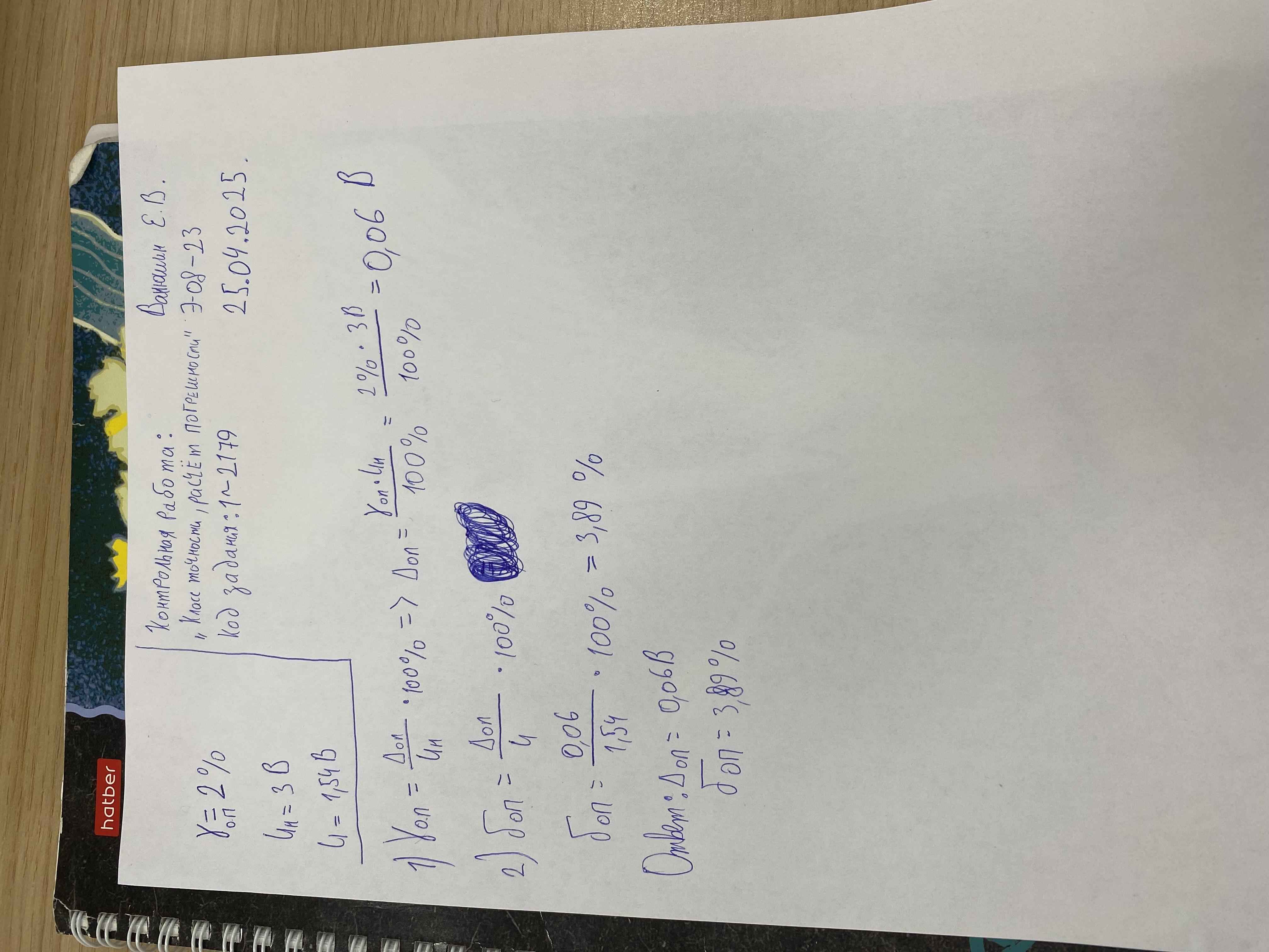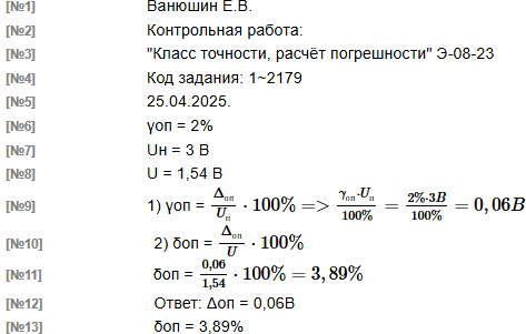 | Вольтметром выполнили измерение напряжение постоянного тока. Вольтметр имеет класс точности 2,0 и диапазон показаний от 0 до 3 В Результат измерения напряжения вольтметром U составляет 1,54 В Рассчитать значения предельной абсолютной Δо.п. и предельной относительной погрешности δо.п. измерения вольтметра. Учитывается лишь основная погрешность вольтметра. В решении следует использовать следующие обозначения параметров Предельная основная приведенная погрешность: γо.п. Нормирующее значение: Uн Измеренное значение: U Основная предельная абсолютная погрешность: Δо.п. Основная предельная относительная погрешность: δо.п. |