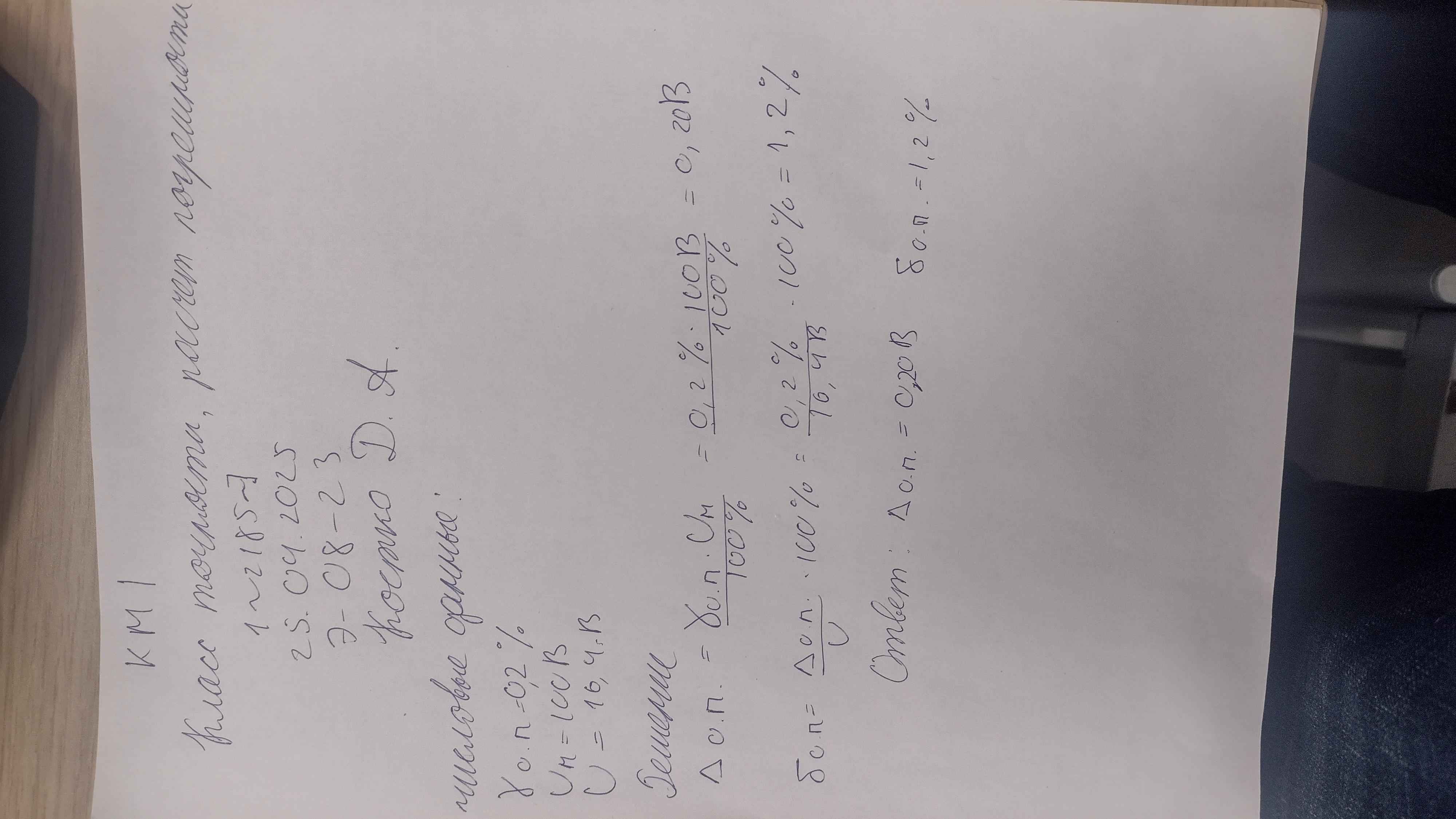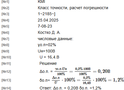 | Вольтметром выполнили измерение напряжение постоянного тока. Вольтметр имеет класс точности 0,2 и диапазон показаний от 0 до 100 В Результат измерения напряжения вольтметром U составляет 16,4 В Рассчитать значения предельной абсолютной Δо.п. и предельной относительной погрешности δо.п. измерения вольтметра. Учитывается лишь основная погрешность вольтметра. В решении следует использовать следующие обозначения параметров Предельная основная приведенная погрешность: γо.п. Нормирующее значение: Uн Измеренное значение: U Основная предельная абсолютная погрешность: Δо.п. Основная предельная относительная погрешность: δо.п. |