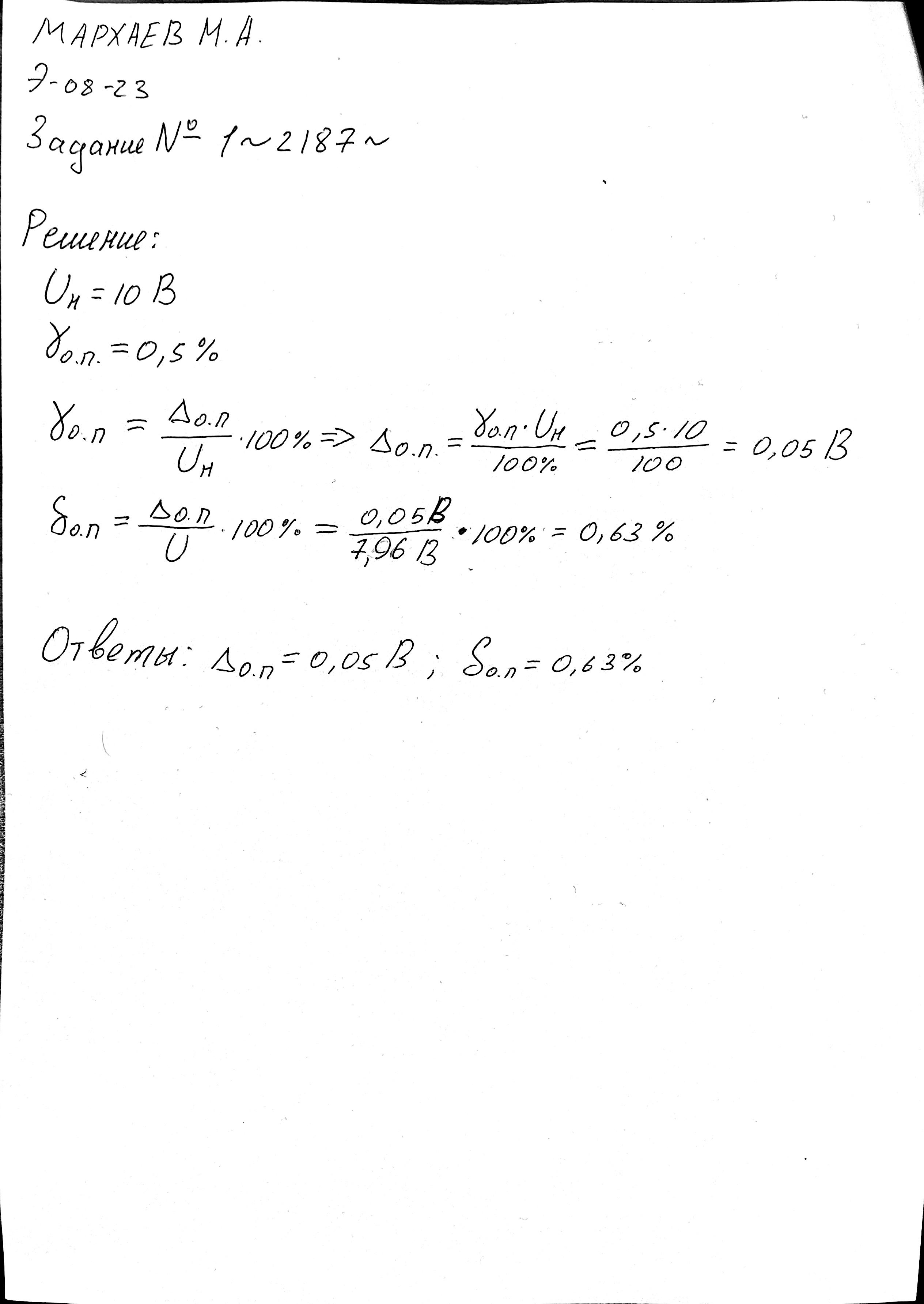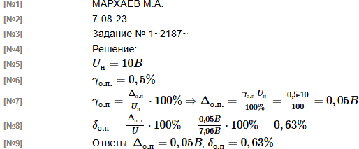 | Вольтметром выполнили измерение напряжение постоянного тока. Вольтметр имеет класс точности 0,5 и диапазон показаний от 0 до 10 В Результат измерения напряжения вольтметром U составляет 7,96 В Рассчитать значения предельной абсолютной Δо.п. и предельной относительной погрешности δо.п. измерения вольтметра. Учитывается лишь основная погрешность вольтметра. В решении следует использовать следующие обозначения параметров Предельная основная приведенная погрешность: γо.п. Нормирующее значение: Uн Измеренное значение: U Основная предельная абсолютная погрешность: Δо.п. Основная предельная относительная погрешность: δо.п. |