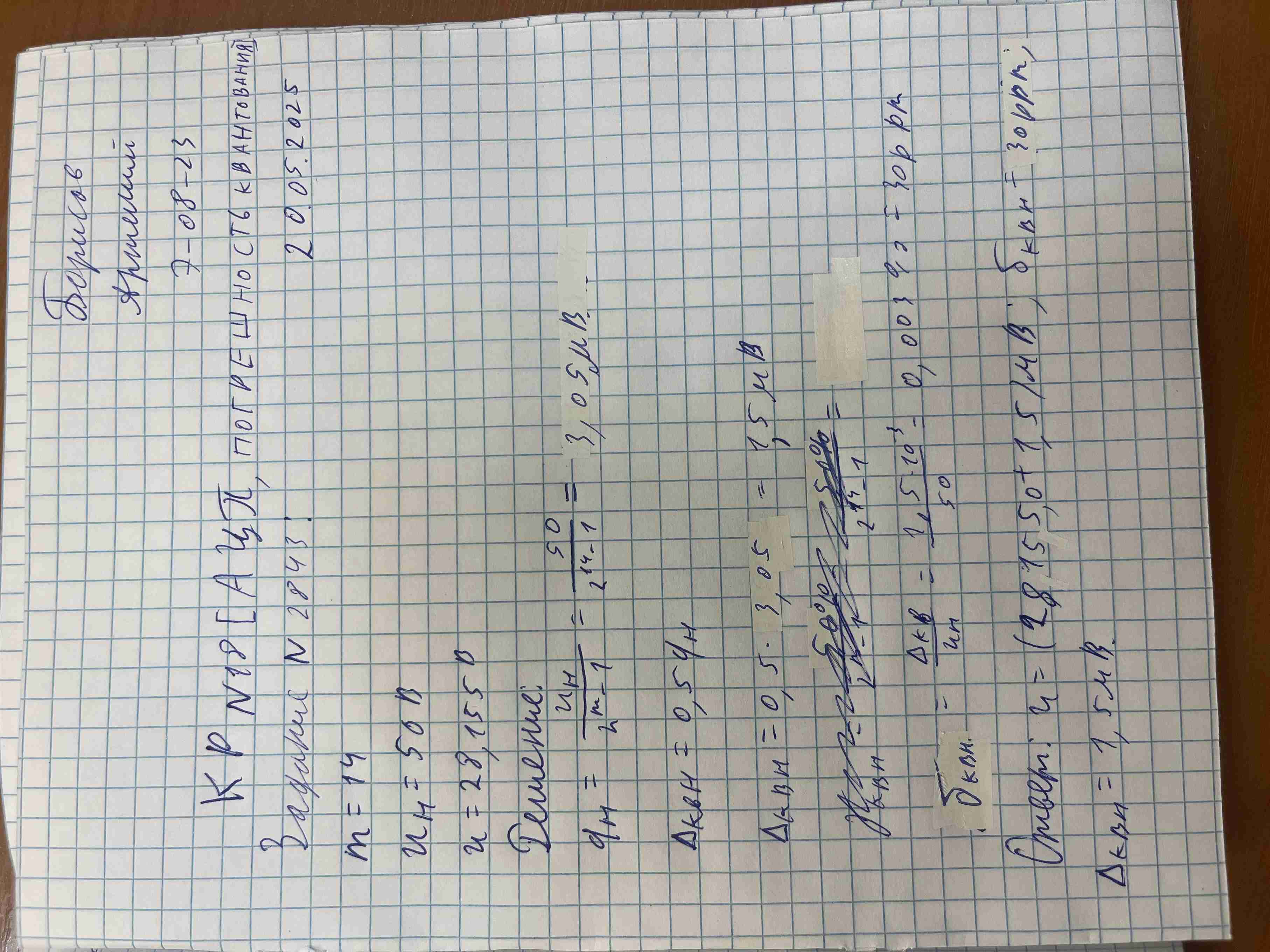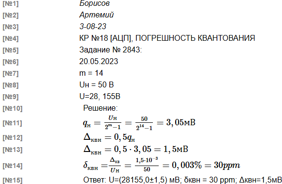 Метрология, КР № 18 [ АЦП, погрешность квантования ]На вход АЦП с разрядностью m= 14 и номинальным значением Uн = 50 В поступает напряжение U = 28.155 В . Каково абсолютное Δкв и относительное δкв значения погрешности квантования при измерении этого напряжения? Записать результат измерения. В решении следует использовать следующие обозначения параметров: m - разрядность АЦП $q_н$ - номинальное значение кванта АЦП При решении задачи обязательно укажите исходные данные. |