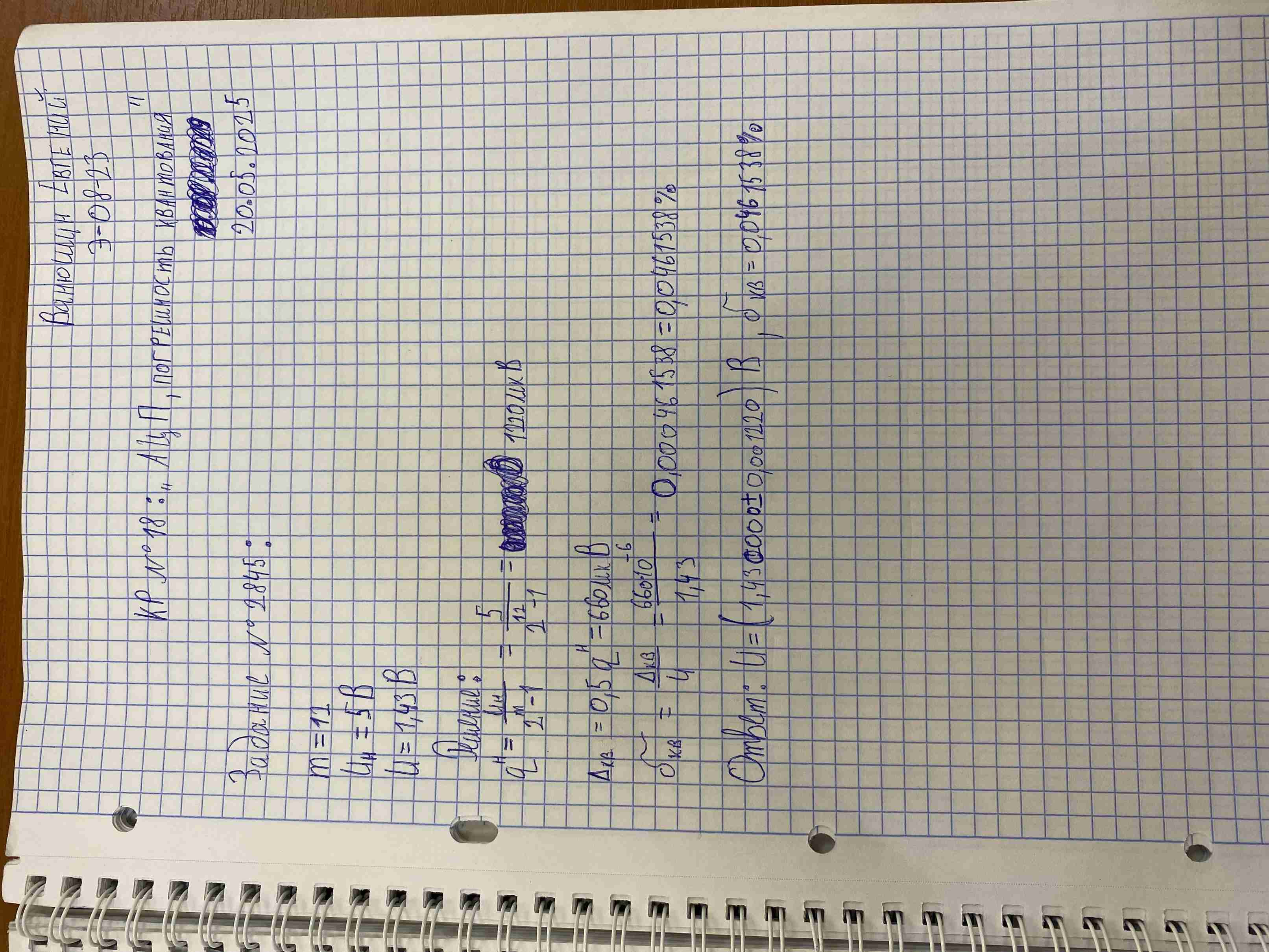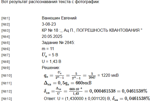 Метрология, КР № 18 [ АЦП, погрешность квантования ]На вход АЦП с разрядностью m= 12 и номинальным значением Uн = 5 В поступает напряжение U = 1.43 В . Каково абсолютное Δкв и относительное δкв значения погрешности квантования при измерении этого напряжения? Записать результат измерения. В решении следует использовать следующие обозначения параметров: m - разрядность АЦП $q_н$ - номинальное значение кванта АЦП При решении задачи обязательно укажите исходные данные. |