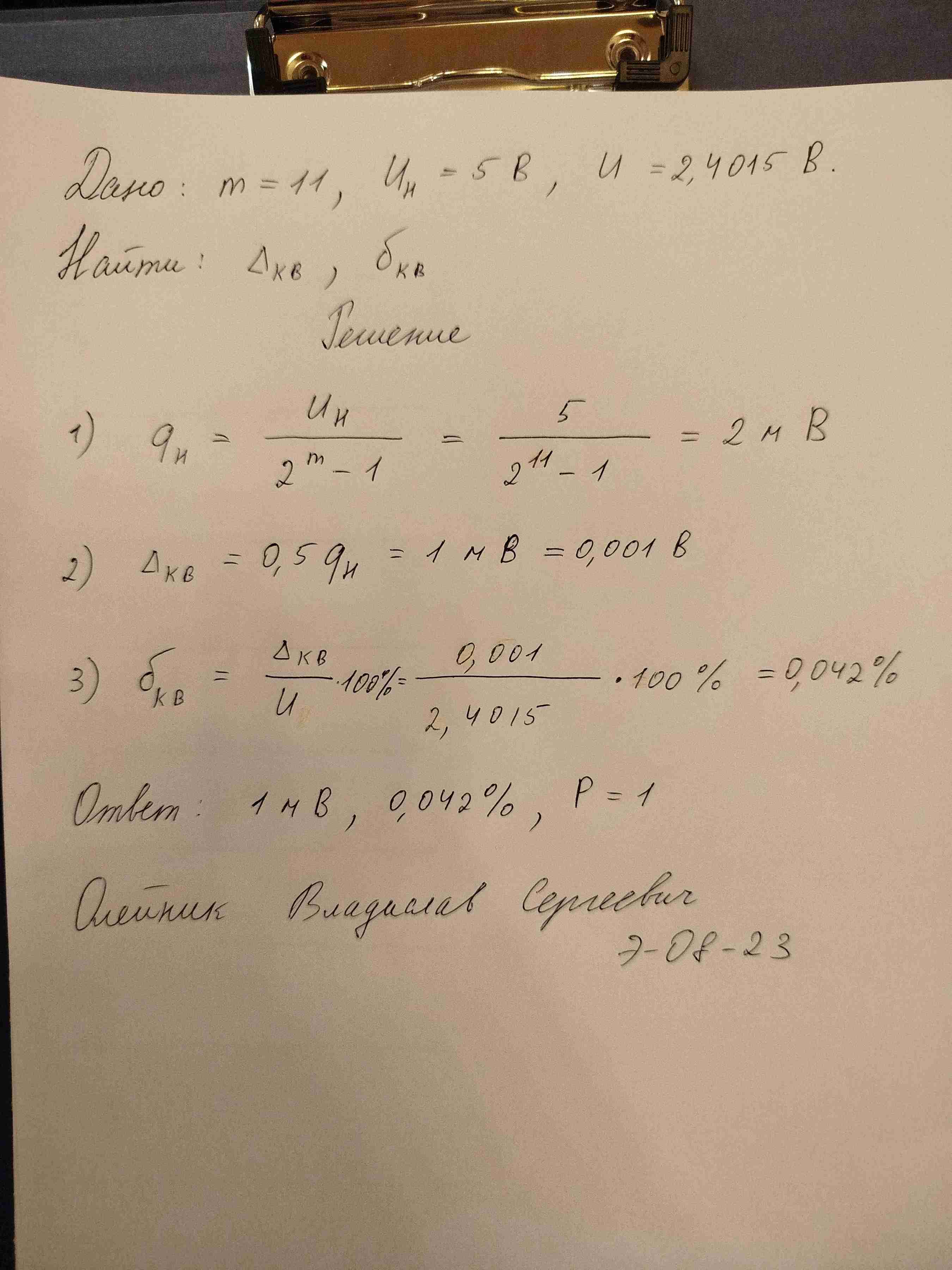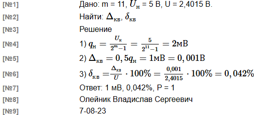 Метрология, КР № 18 [ АЦП, погрешность квантования ]На вход АЦП с разрядностью m= 11 и номинальным значением Uн = 5 В поступает напряжение U = 2.4015 В . Каково абсолютное Δкв и относительное δкв значения погрешности квантования при измерении этого напряжения? Записать результат измерения. В решении следует использовать следующие обозначения параметров: m - разрядность АЦП $q_н$ - номинальное значение кванта АЦП При решении задачи обязательно укажите исходные данные. |