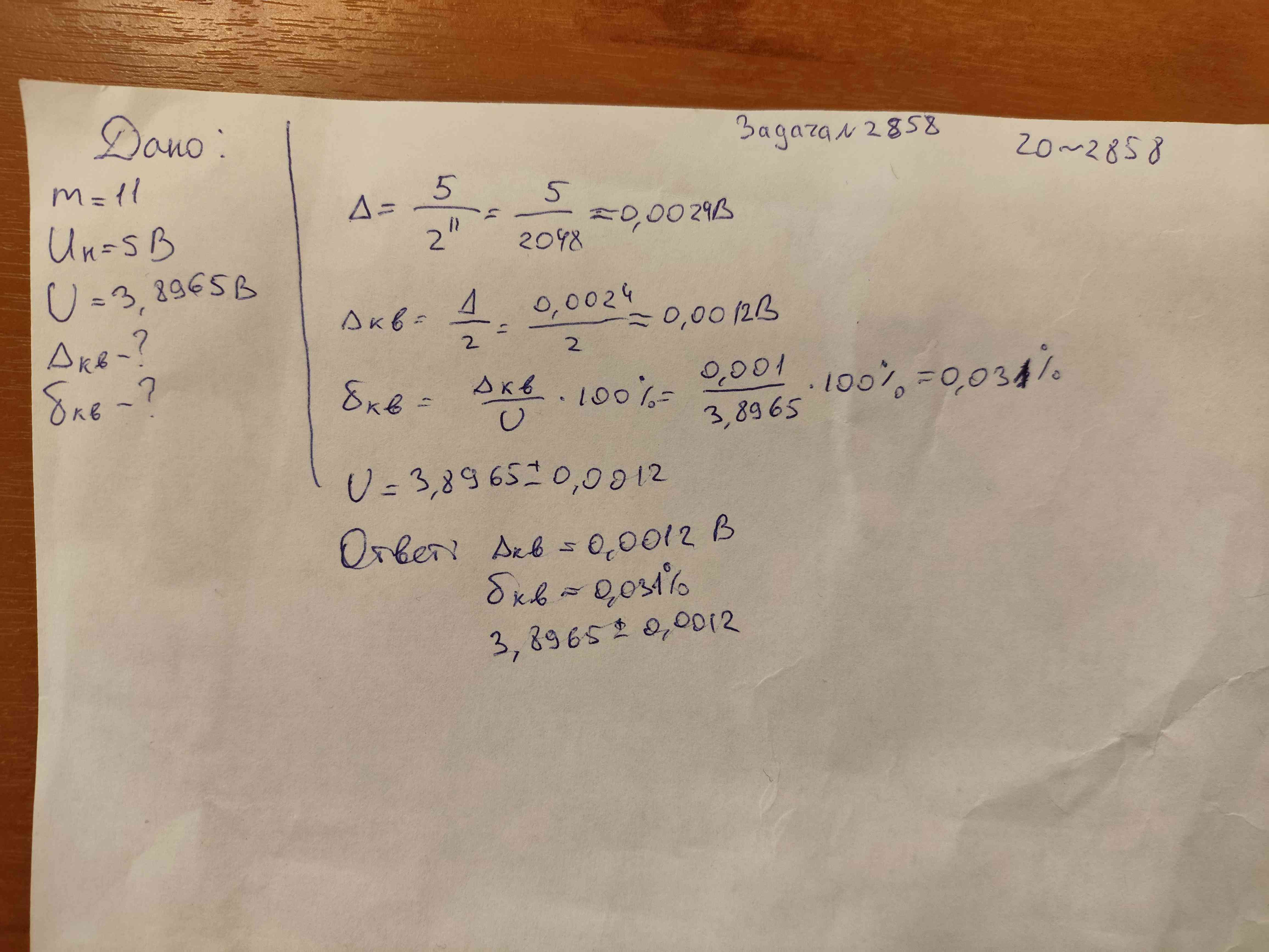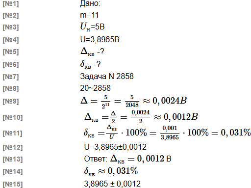 Метрология, КР № 18 [ АЦП, погрешность квантования ]На вход АЦП с разрядностью m= 11 и номинальным значением Uн = 5 В поступает напряжение U = 3.8965 В . Каково абсолютное Δкв и относительное δкв значения погрешности квантования при измерении этого напряжения? Записать результат измерения. В решении следует использовать следующие обозначения параметров: m - разрядность АЦП $q_н$ - номинальное значение кванта АЦП При решении задачи обязательно укажите исходные данные. |