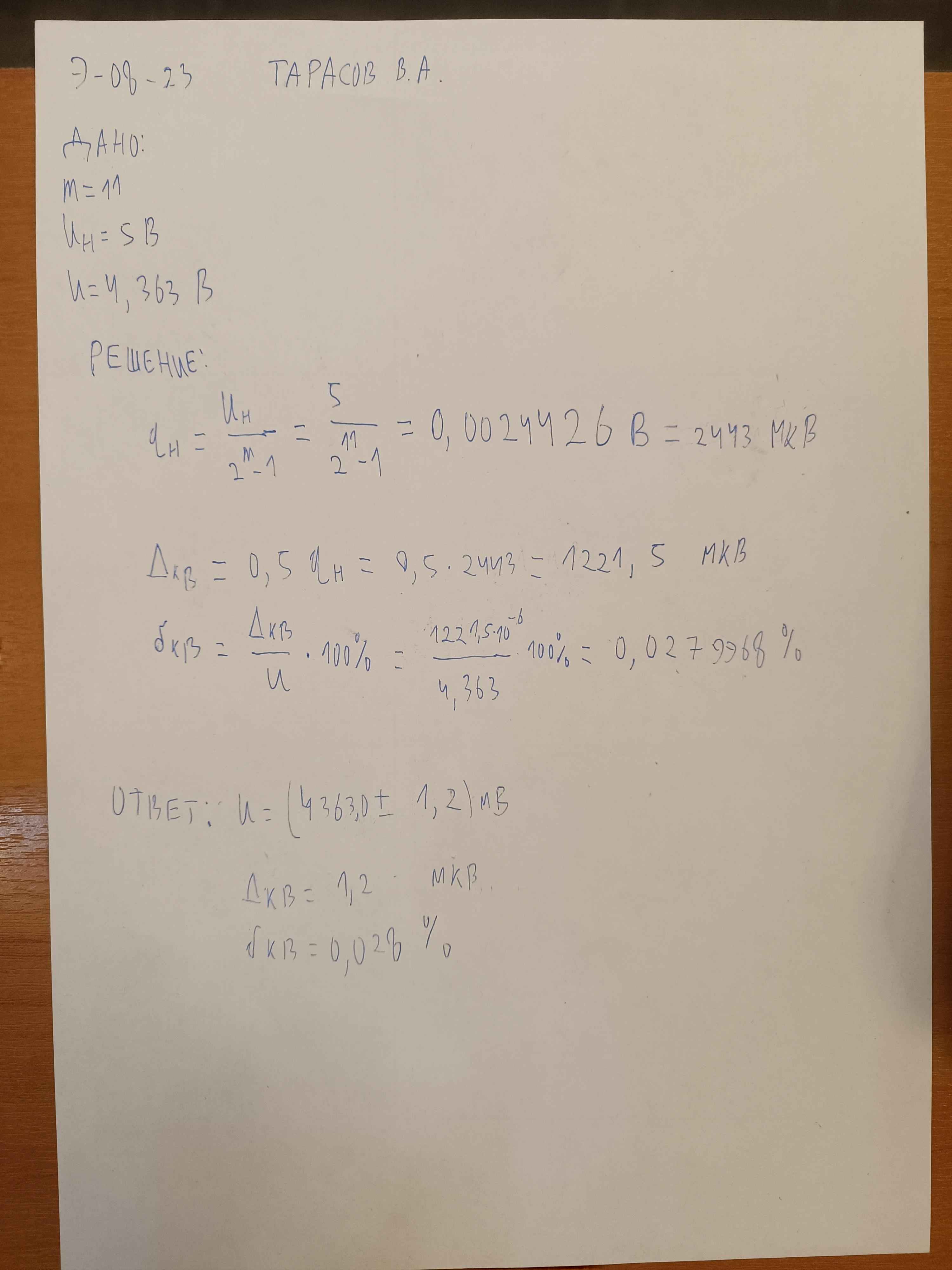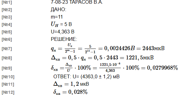 Метрология, КР № 18 [ АЦП, погрешность квантования ]На вход АЦП с разрядностью m= 11 и номинальным значением Uн = 5 В поступает напряжение U = 4.363 В . Каково абсолютное Δкв и относительное δкв значения погрешности квантования при измерении этого напряжения? Записать результат измерения. В решении следует использовать следующие обозначения параметров: m - разрядность АЦП $q_н$ - номинальное значение кванта АЦП При решении задачи обязательно укажите исходные данные. |