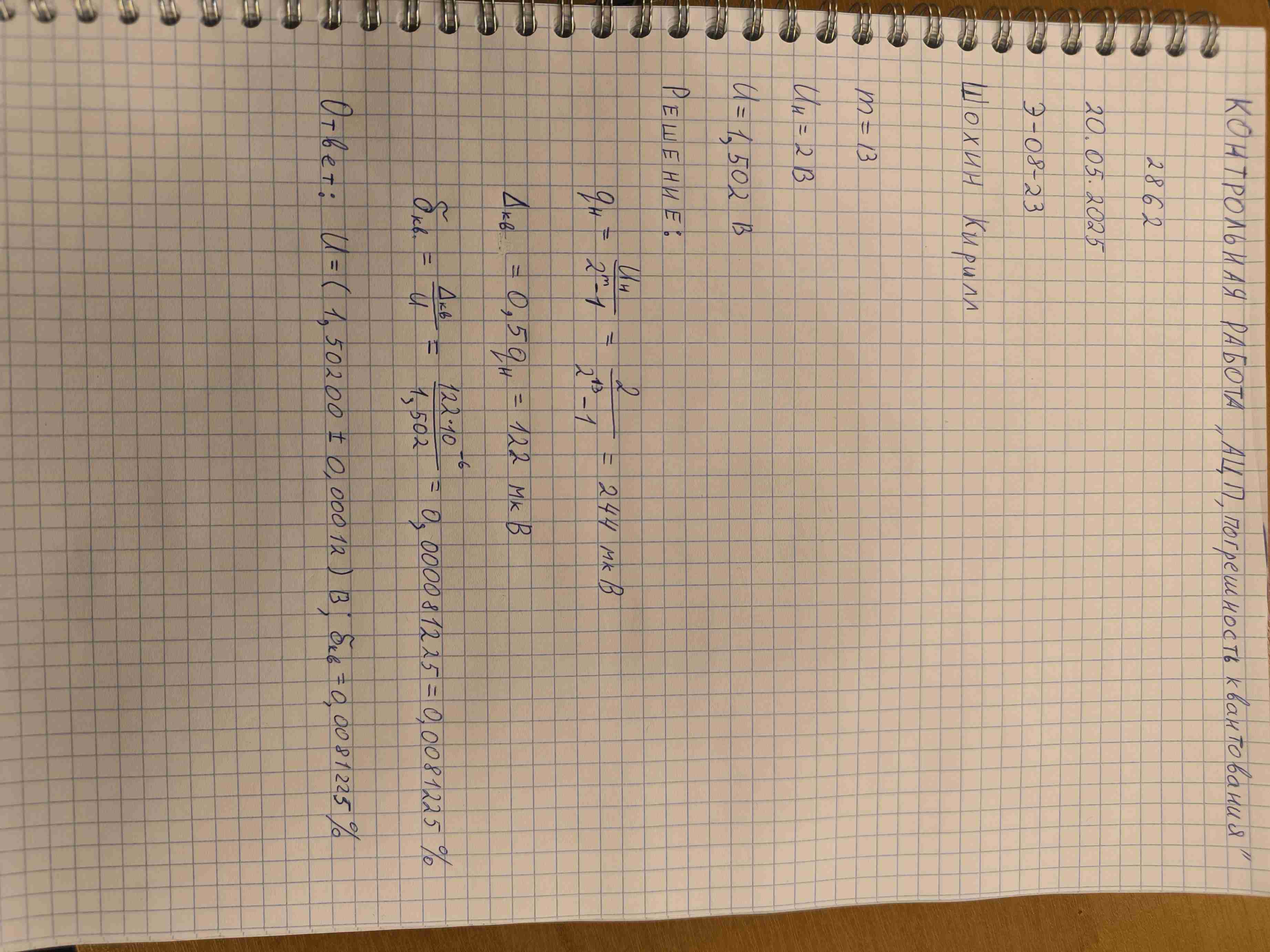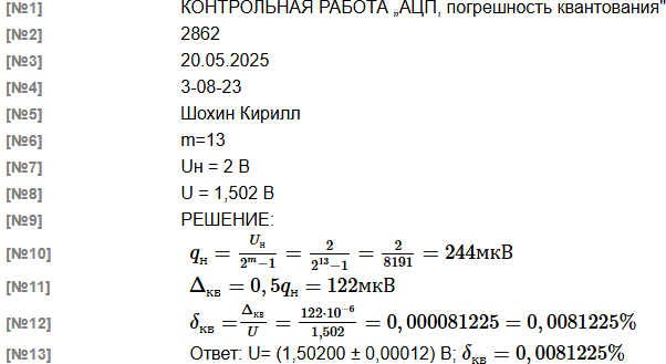 Метрология, КР № 18 [ АЦП, погрешность квантования ]На вход АЦП с разрядностью m= 13 и номинальным значением Uн = 2 В поступает напряжение U = 1.502 В . Каково абсолютное Δкв и относительное δкв значения погрешности квантования при измерении этого напряжения? Записать результат измерения. В решении следует использовать следующие обозначения параметров: m - разрядность АЦП $q_н$ - номинальное значение кванта АЦП При решении задачи обязательно укажите исходные данные. |