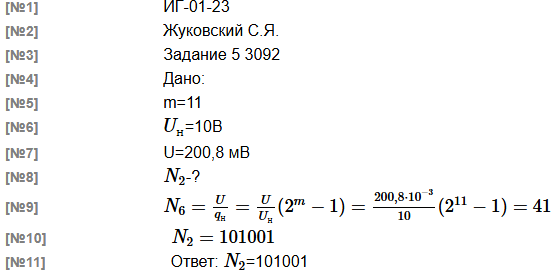 Имеется ЦАП разрядностью m = 11 с номинальным напряжением Uн = 10 В Какой двоичный код N2 надо подать на вход ЦАП, чтобы на выходе появилось напряжение U ≈ 200.8 мВ В решении следует использовать следующие обозначения параметров: m - разрядность АЦП qн - номинальное значение кванта ЦАП При решении задачи обязательно укажите исходные данные. При записи результатов промежуточных расчетов Целесообразно использовать не менее 5 значащих цифр. |