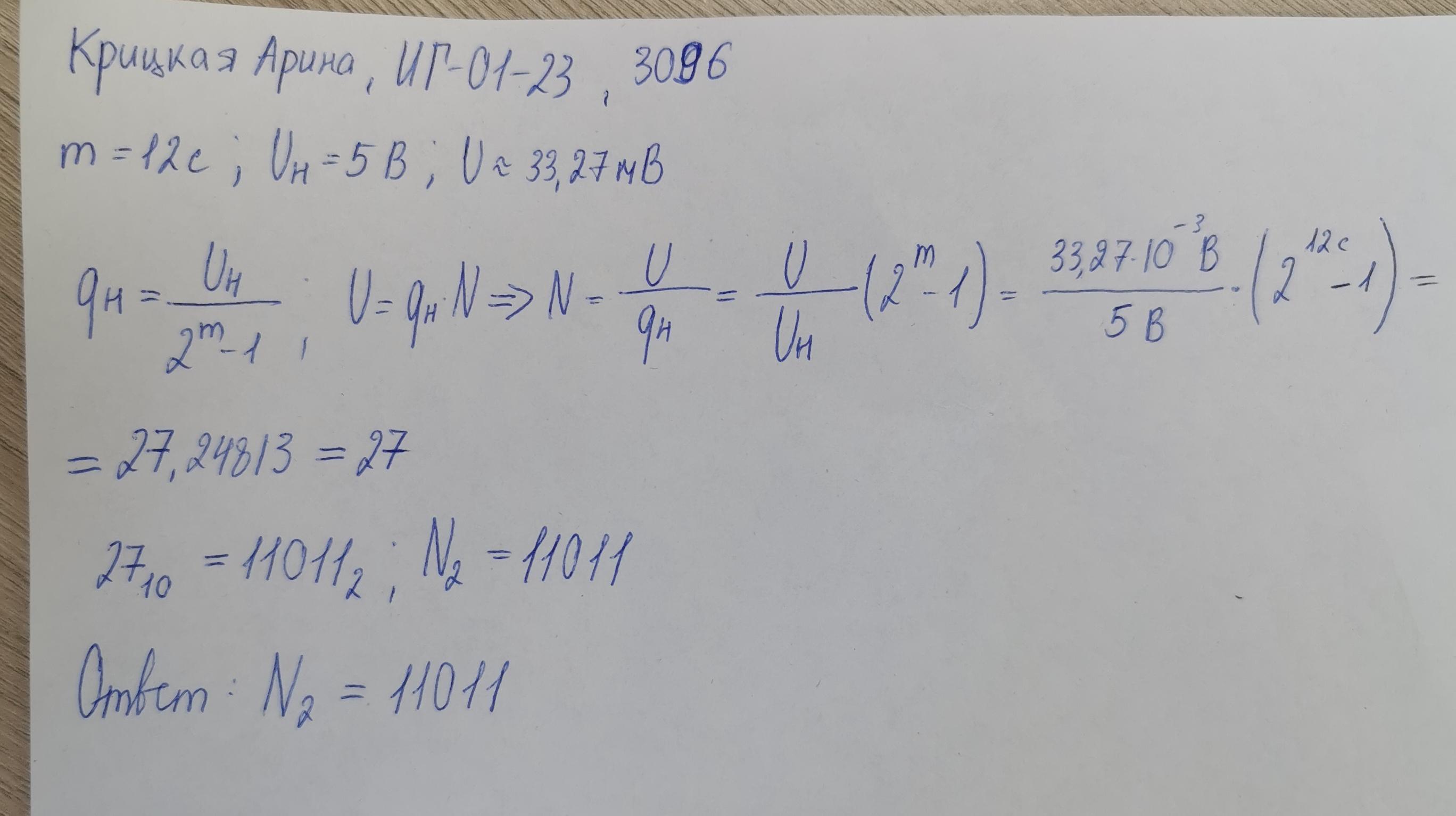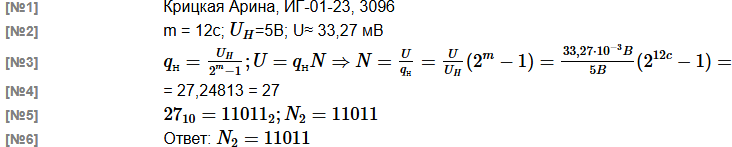 Имеется ЦАП разрядностью m = 12 с номинальным напряжением Uн = 5 В Какой двоичный код N2 надо подать на вход ЦАП, чтобы на выходе появилось напряжение U ≈ 33.27 мВ В решении следует использовать следующие обозначения параметров: m - разрядность АЦП qн - номинальное значение кванта ЦАП При решении задачи обязательно укажите исходные данные. При записи результатов промежуточных расчетов Целесообразно использовать не менее 5 значащих цифр. |