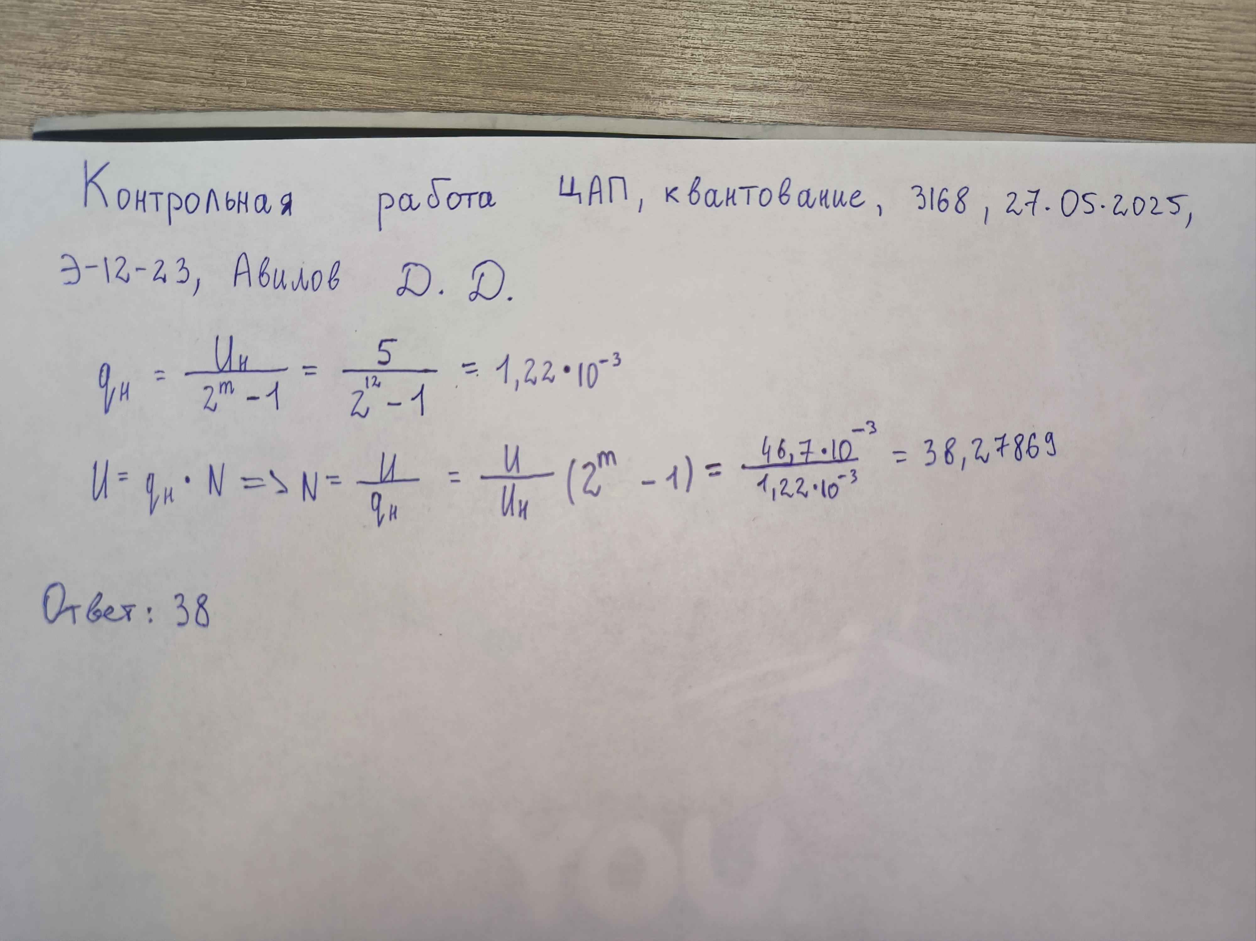 Имеется ЦАП разрядностью m = 12 с номинальным напряжением Uн = 5 В Какой двоичный код N2 надо подать на вход ЦАП, чтобы на выходе появилось напряжение U ≈ 46.7 мВ В решении следует использовать следующие обозначения параметров: m - разрядность АЦП qн - номинальное значение кванта ЦАП При решении задачи обязательно укажите исходные данные. При записи результатов промежуточных расчетов Целесообразно использовать не менее 5 значащих цифр. |