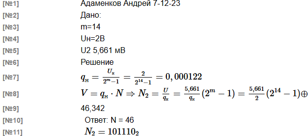 Имеется ЦАП разрядностью m = 14 с номинальным напряжением Uн = 2 В Какой двоичный код N2 надо подать на вход ЦАП, чтобы на выходе появилось напряжение U ≈ 5.661 мВ В решении следует использовать следующие обозначения параметров: m - разрядность АЦП qн - номинальное значение кванта ЦАП При решении задачи обязательно укажите исходные данные. При записи результатов промежуточных расчетов Целесообразно использовать не менее 5 значащих цифр. |