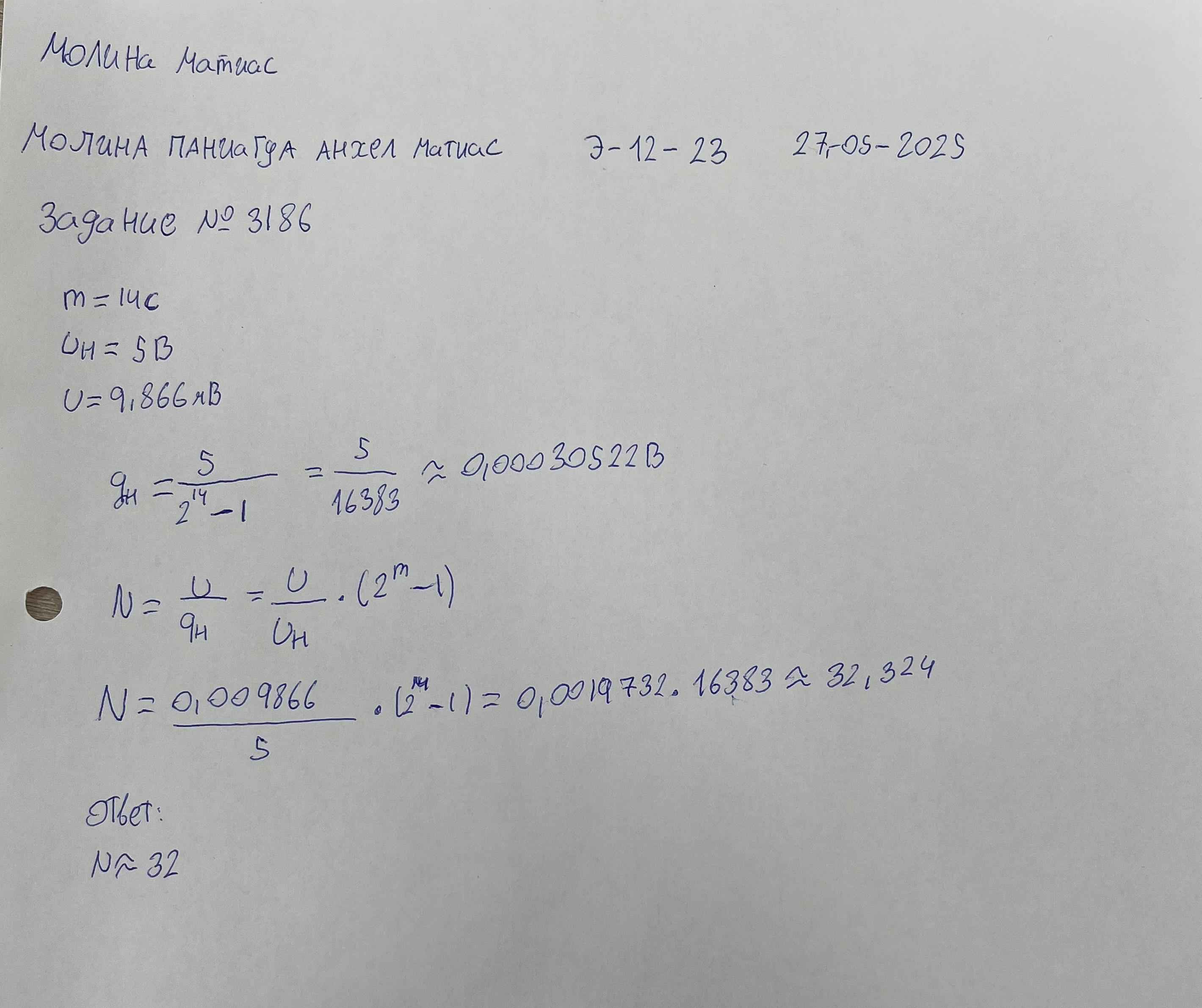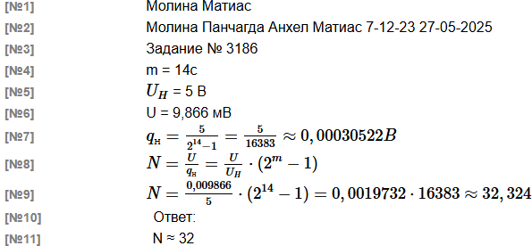 Имеется ЦАП разрядностью m = 14 с номинальным напряжением Uн = 5 В Какой двоичный код N2 надо подать на вход ЦАП, чтобы на выходе появилось напряжение U ≈ 9.866 мВ В решении следует использовать следующие обозначения параметров: m - разрядность АЦП qн - номинальное значение кванта ЦАП При решении задачи обязательно укажите исходные данные. При записи результатов промежуточных расчетов Целесообразно использовать не менее 5 значащих цифр. |