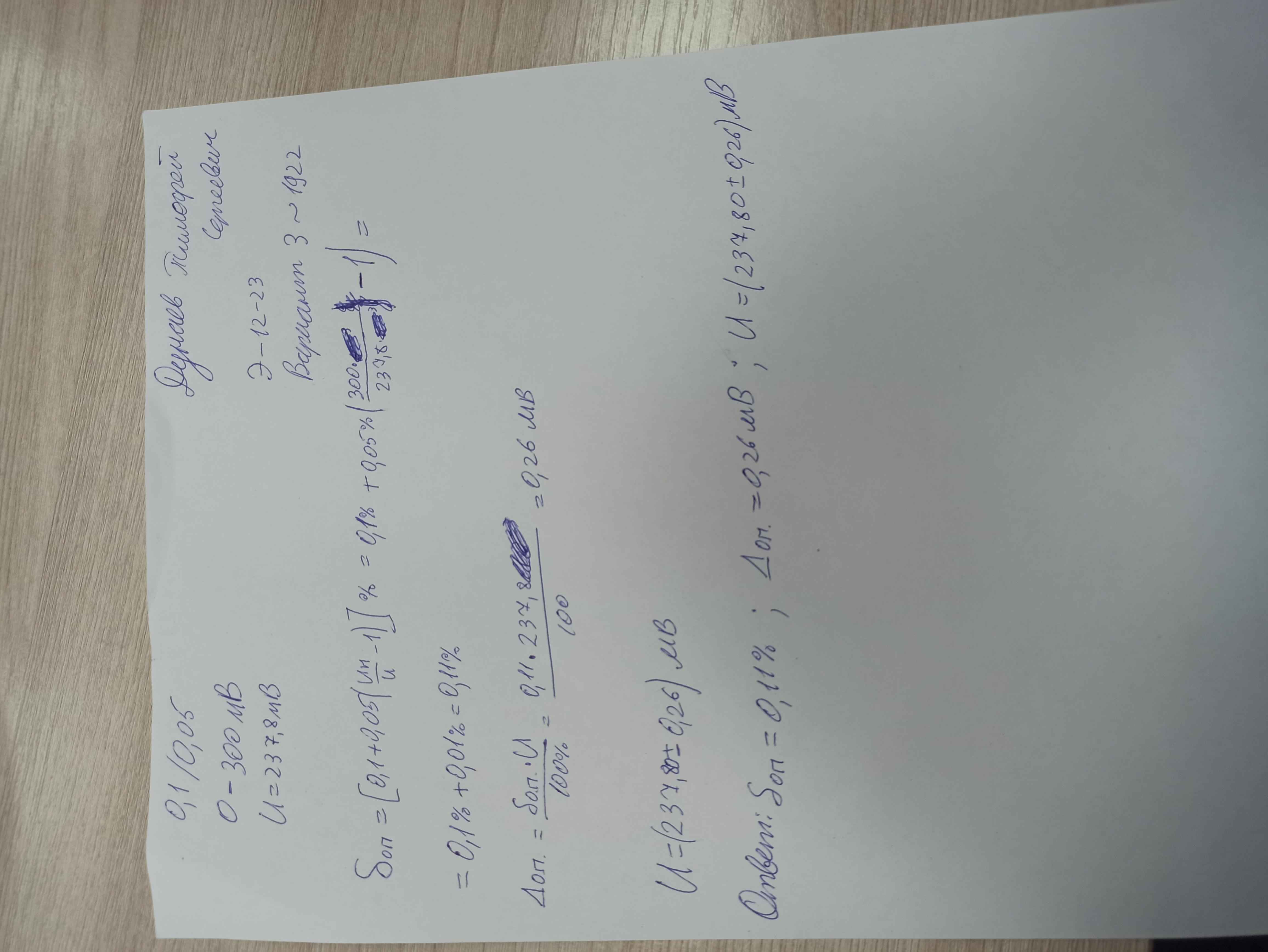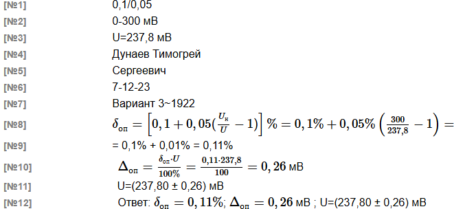 | Вольтметром, на котором обозначен класс точности 0,1/0,05 и который имеет диапазон показаний от 0 до 300 мВ, измерили напряжение постоянного тока. Результат измерения U составляет 237,8 мВ Рассчитать значения предельной абсолютной Δо.п. и предельной относительной погрешности δо.п. этого измерения. Учитывается лишь основная погрешность вольтметра. В решении следует использовать следующие обозначения параметров: нормирующее значение: Uн измеренное значение: U основная предельная абсолютная погрешность: Δо.п. основная предельная относительная погрешность: δо.п. |